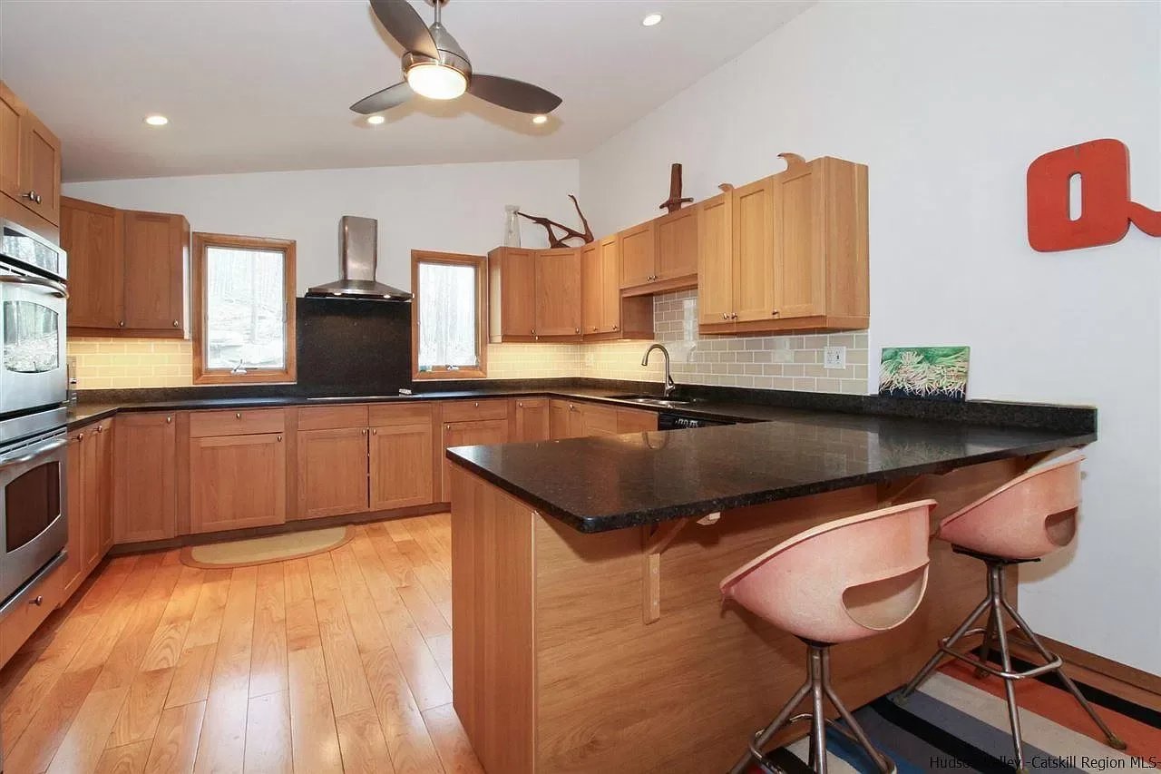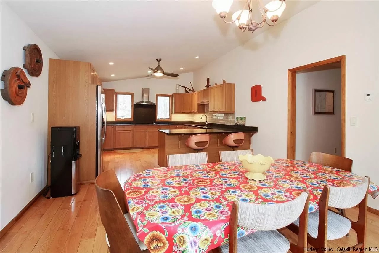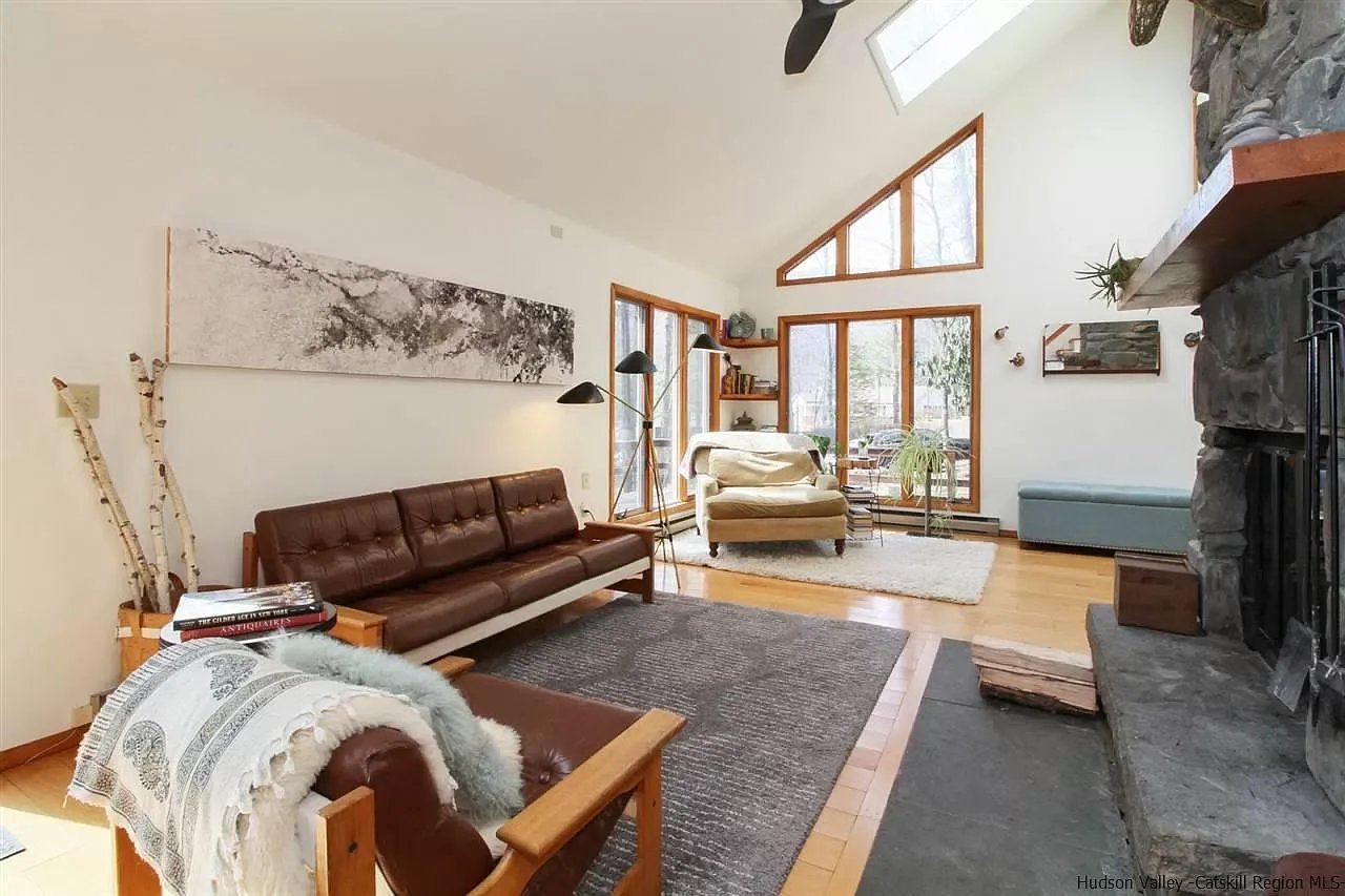 Easy-living contemporary on 4 acres with heated inground pool just in time for warmer weather. Spacious living room with skylit cathedral ceilings and plenty of natural light enjoys a soaring stone fireplace and views of bountiful nature. The oversized and updated kitchen is a cook's paradise with loads of storage and counter space, room for a crowd to hang out and prepare meals together, and an adjacent dining area that opens to a stone patio. There's a bedroom on the first floor and two upstairs; all are spacious and comfortable. The land is mostly wooded with rock outcroppings and there's plenty of decking for entertaining and hanging out. The shed has electric service and is a great place to store gear or convert to a higher use. The home is conveniently situated between Stone Ridge/High Falls and Woodstock, and close to the Ashokan Reservoir, Minnewaska State Park, the Mohonk Preserve, and vibrant Kingston.