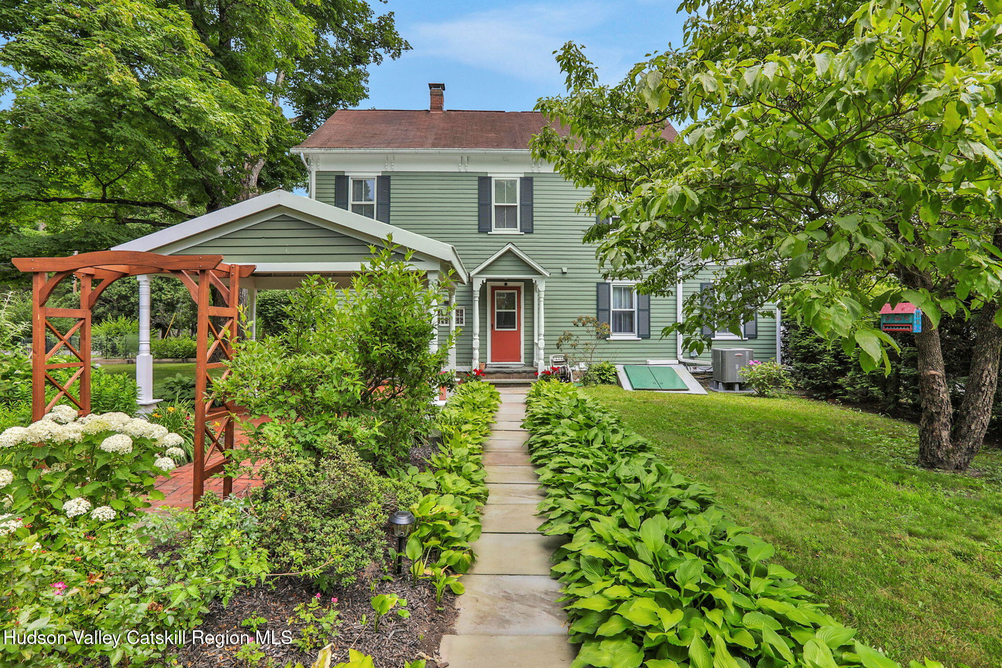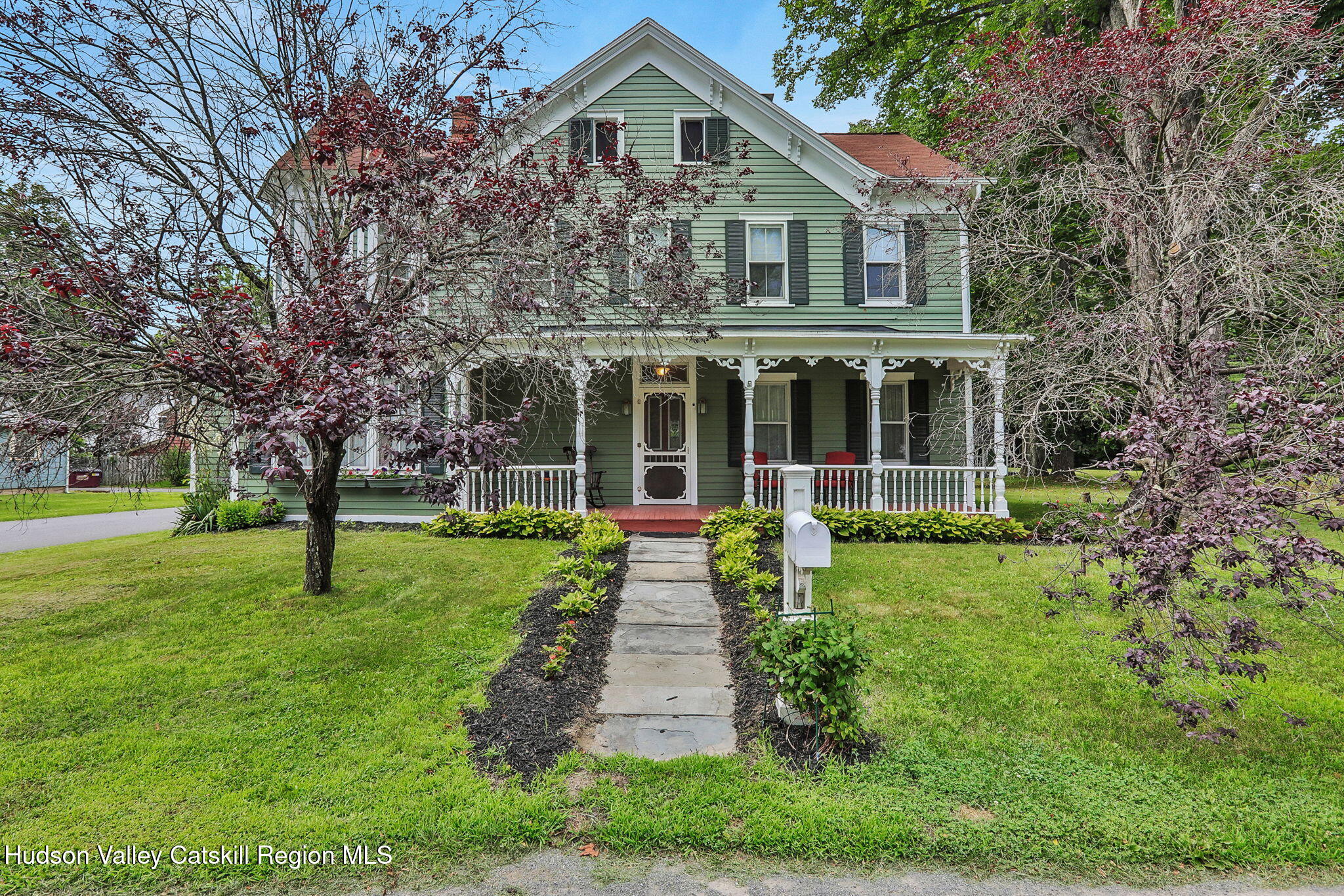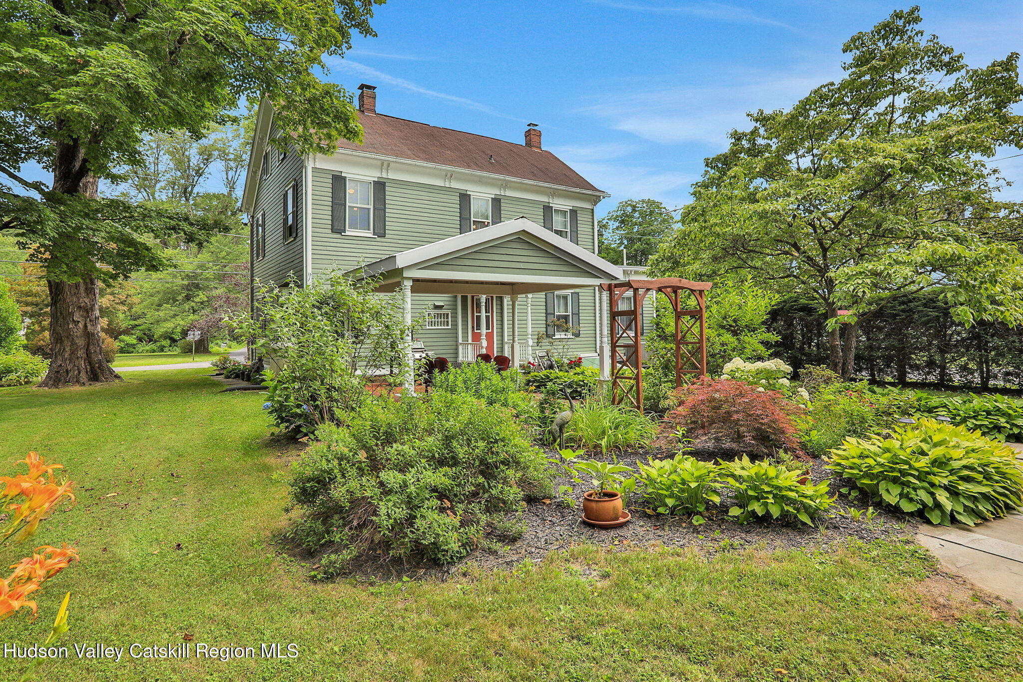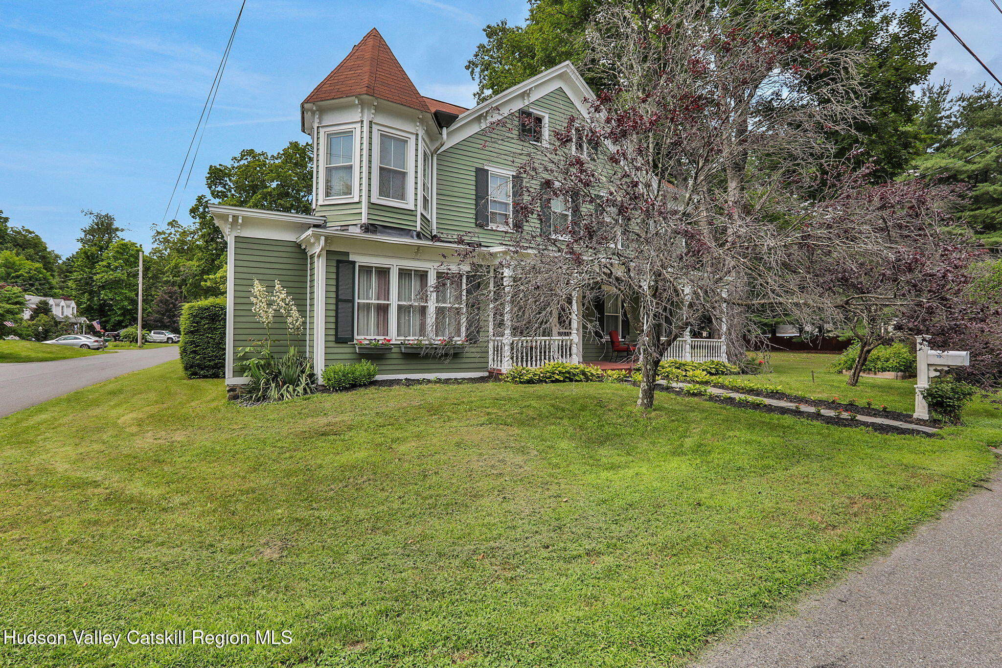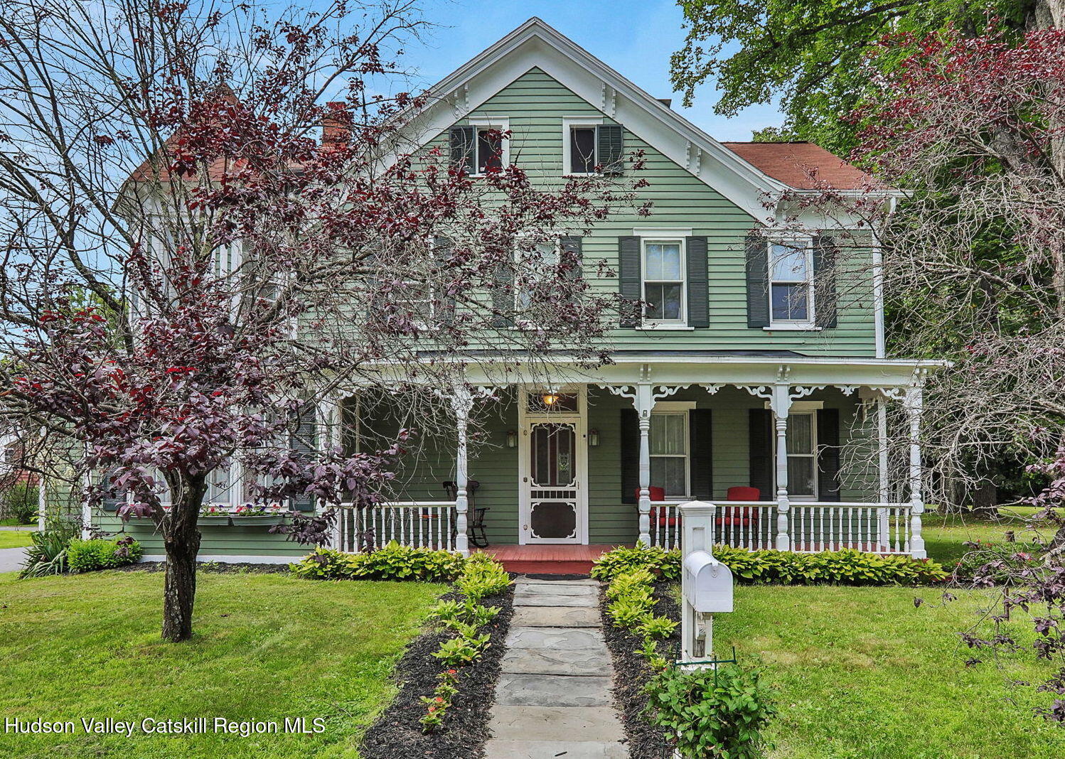 This beautiful Victorian home retains its old-world charm inside and out, yet it's been so well cared for, you'll have little to do to maintain it. Inside, you'll find striking wide-board pine flooring, classic decorative trim, built-in cabinets, and original doors and hardware. The home has comfortably spacious rooms, a full bath on each floor, a well-equipped working kitchen with a lovely breakfast area, and a full dry basement. Outside, enjoy the front porch entry, pretty storybook details, bay windows and second story turret. This turret enhances the primary bedroom with a cozy office space or reading nook. The second floor also hosts three other bedrooms, a bathroom with tub, and access to the gorgeous untouched full attic to use as you wish. The first floor offers spacious rooms for separate living and dining, plus a den and full bathroom with shower. If need be, the den can be easily turned into a sleeping room or private office by closing one of two doorways. The grounds are beautifully landscaped with lush gardens, an inviting covered patio that makes a great outdoor room with a feeling of privacy, and a cute outbuilding. This well-maintained home was recently painted and has a new central heat pump plus a new oil furnace for backup. The garage roof is recent, and the garage offers a full second story that would make a great studio or accessory dwelling unit, now encouraged by the town. Rumor has it that this home's storied past includes hosting both the Tillson post office and a millinery shop. Now it's a wonderful home in the friendly hamlet of Tillson where you can be mere steps from the hugely popular Darlings Roadhouse, less than two miles from Rosendale's quaint Main Street, and a short drive to New Paltz or Kingston. Catch the NYC bus one short block away. It's really a super location.