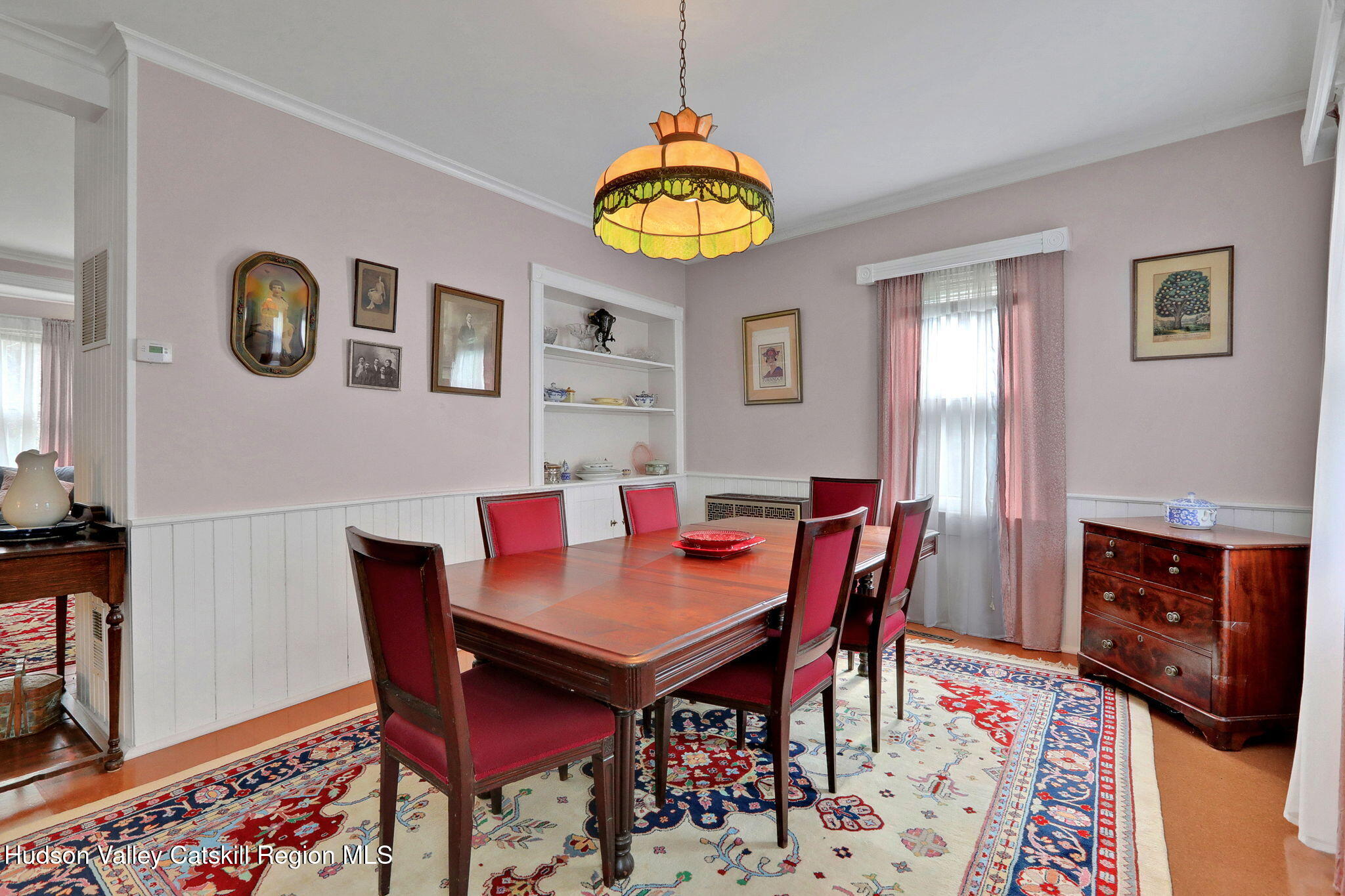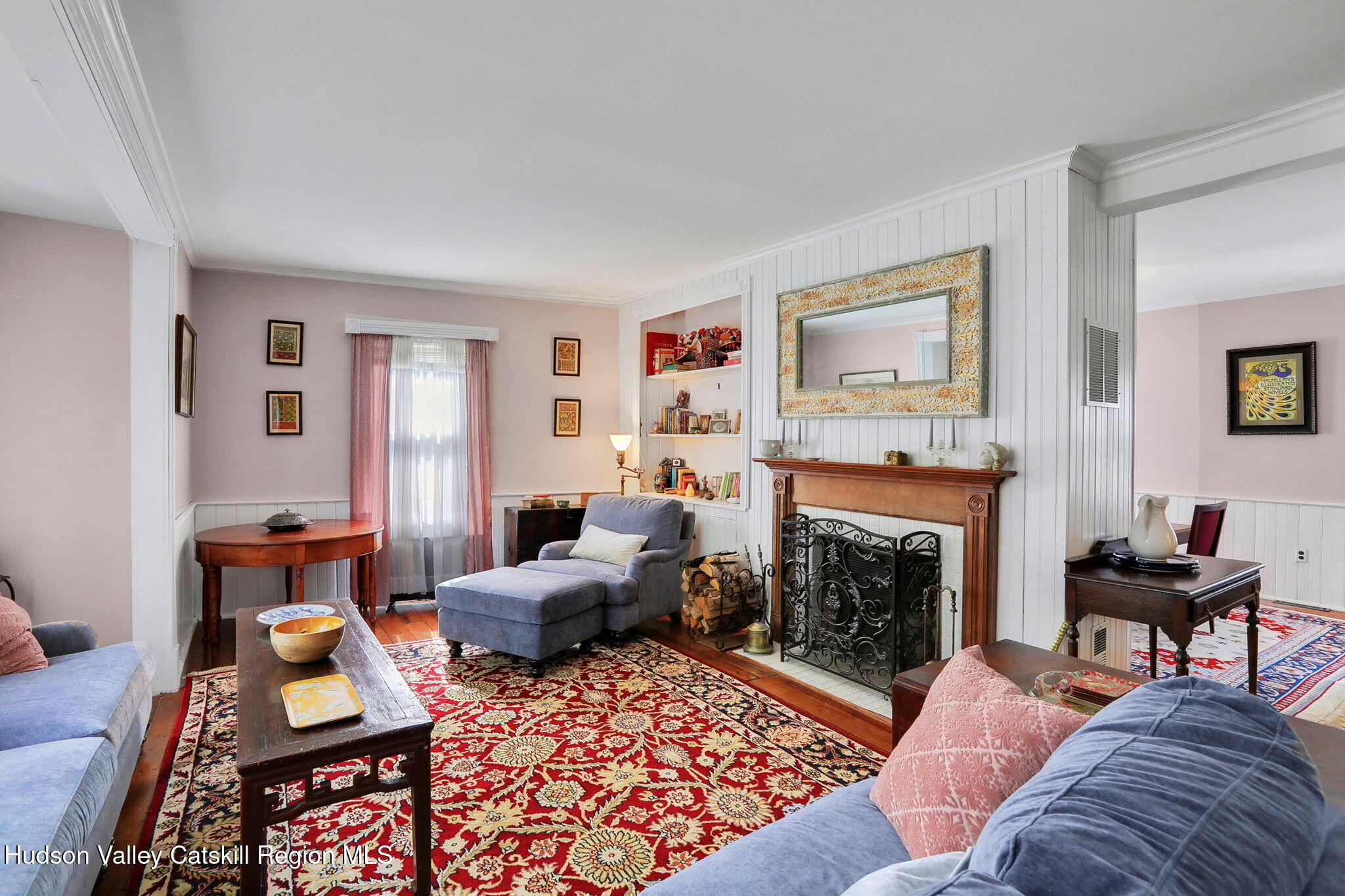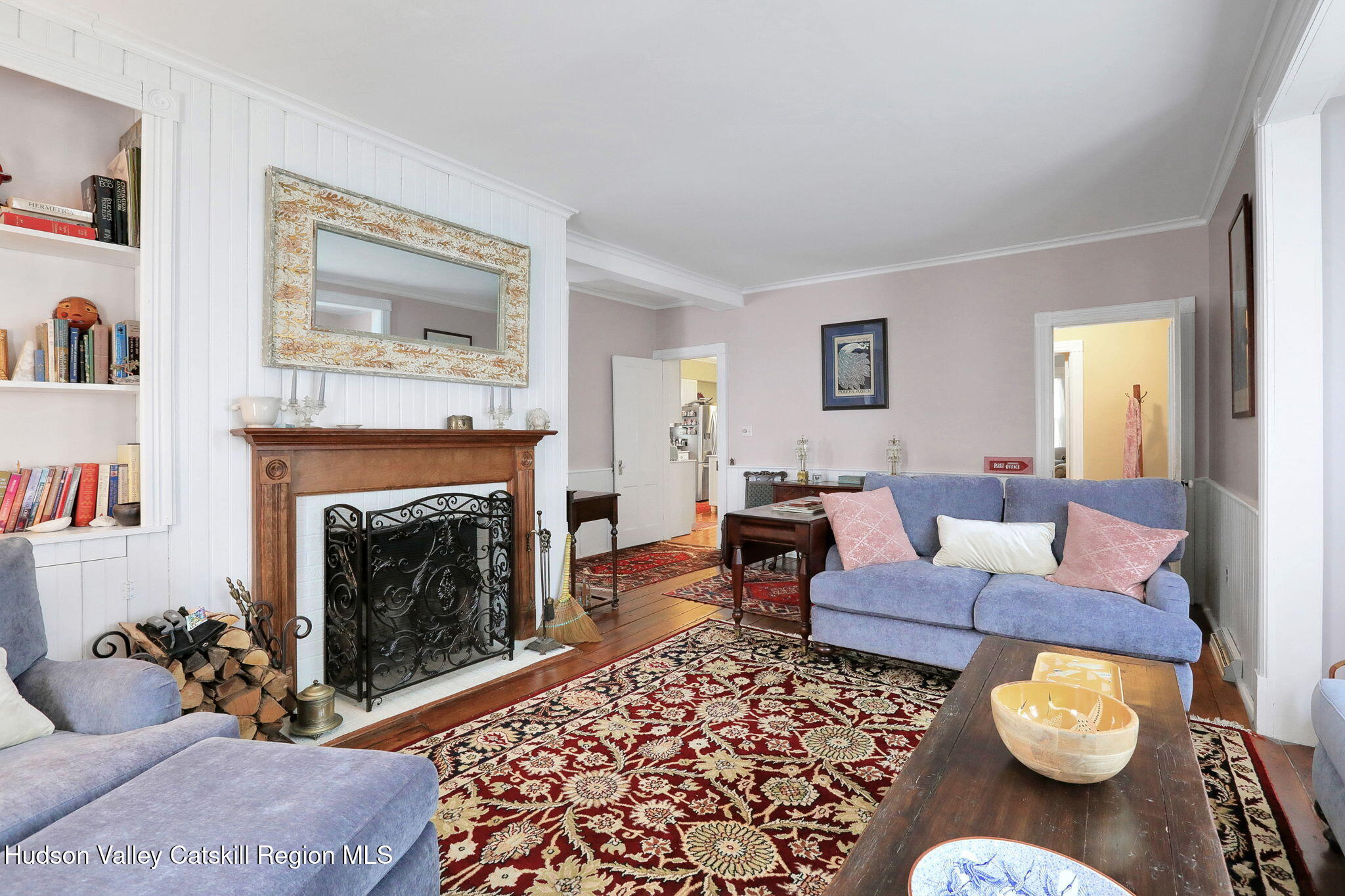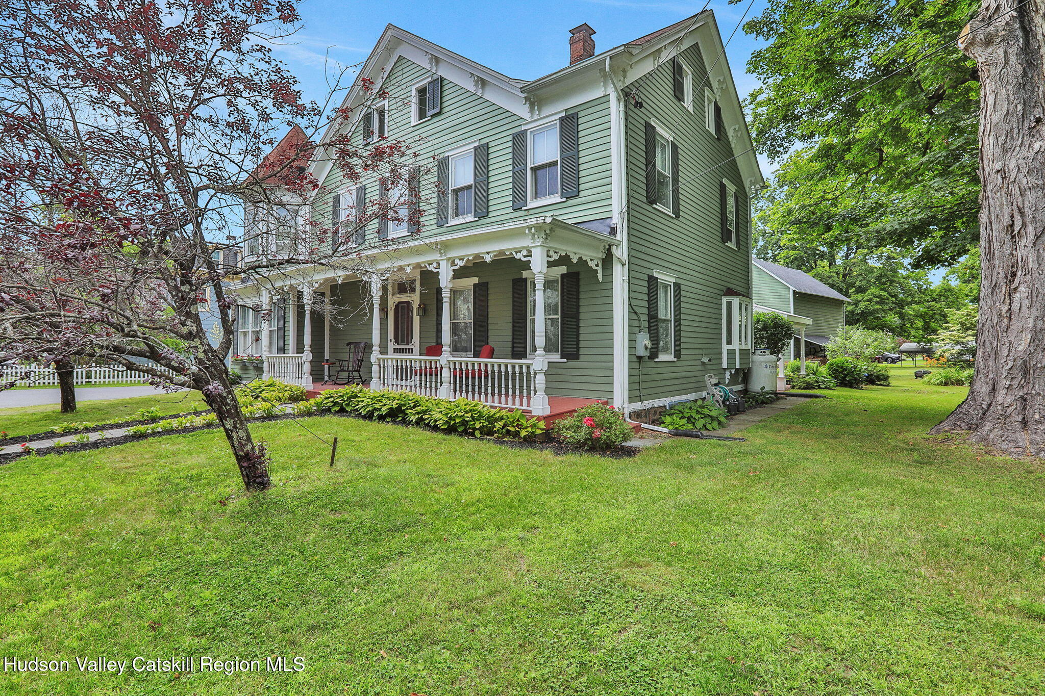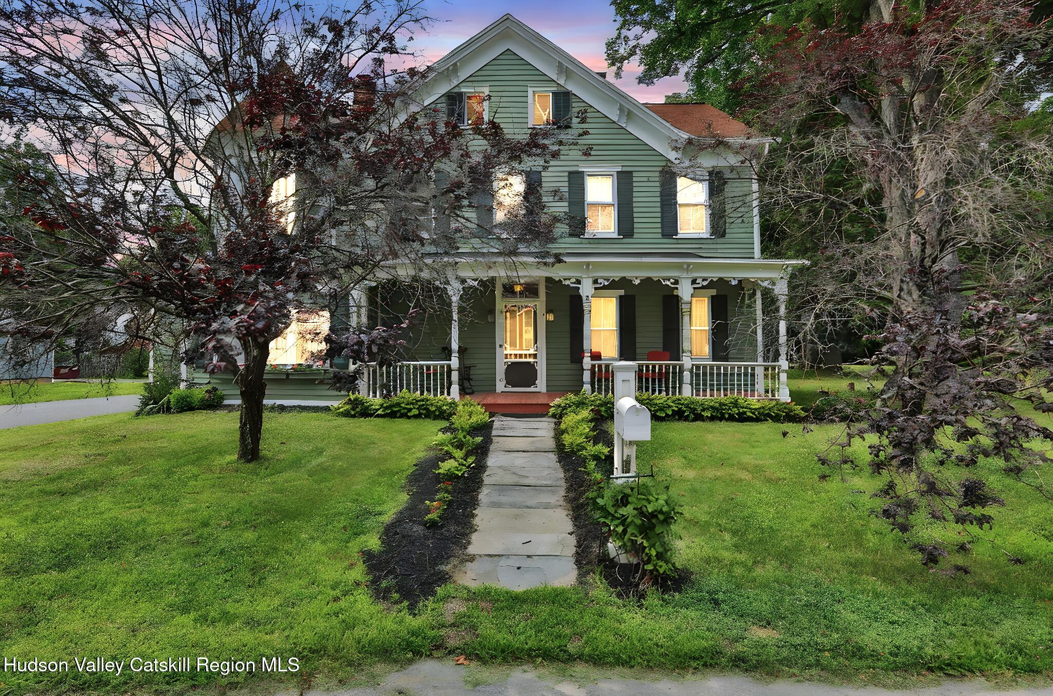 This beautiful Victorian home retains its old-world charm inside and out, yet it's been so well cared for, you'll have little to do to maintain it. Inside, you'll find striking wide-board pine flooring, classic decorative trim, built-in cabinets, and original doors and hardware. The home has comfortably spacious rooms, a full bath on each floor, a well-equipped working kitchen with a lovely breakfast area, and a full dry basement. Outside, enjoy the front porch entry, pretty storybook details, bay windows and second story turret. This turret enhances the primary bedroom with a cozy office space or reading nook. The second floor also hosts three other bedrooms, a bathroom with tub, and access to the gorgeous untouched full attic to use as you wish. The first floor offers spacious rooms for separate living and dining, plus a den and full bathroom with shower. If need be, the den can be easily turned into a sleeping room or private office by closing one of two doorways. The grounds are beautifully landscaped with lush gardens, an inviting covered patio that makes a great outdoor room with a feeling of privacy, and a cute outbuilding. This well-maintained home was recently painted and has a new central heat pump plus a new oil furnace for backup. The garage roof is recent, and the garage offers a full second story that would make a great studio or accessory dwelling unit, now encouraged by the town. Rumor has it that this home's storied past includes hosting both the Tillson post office and a millinery shop. Now it's a wonderful home in the friendly hamlet of Tillson where you can be mere steps from the hugely popular Darlings Roadhouse, less than two miles from Rosendale's quaint Main Street, and a short drive to New Paltz or Kingston. Catch the NYC bus one short block away. It's really a super location.