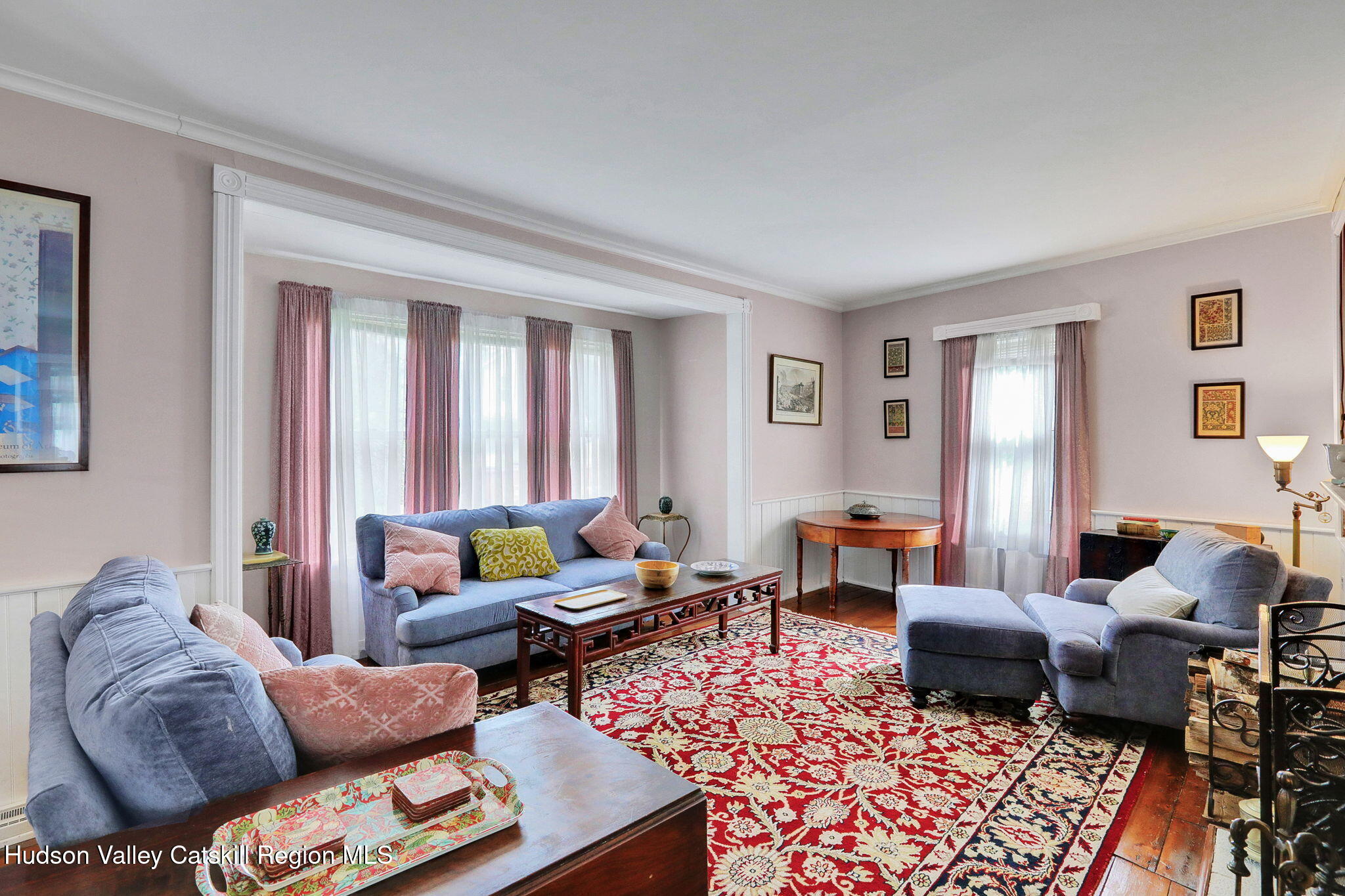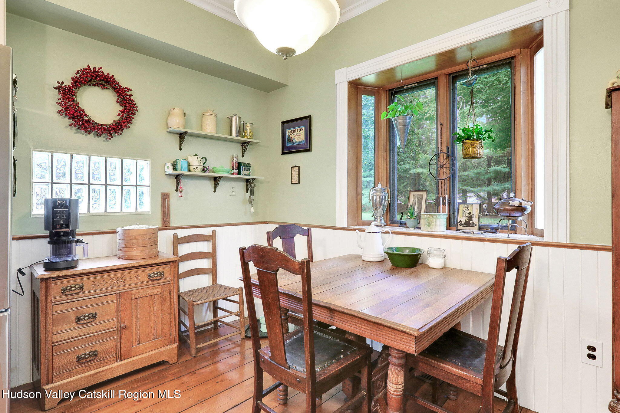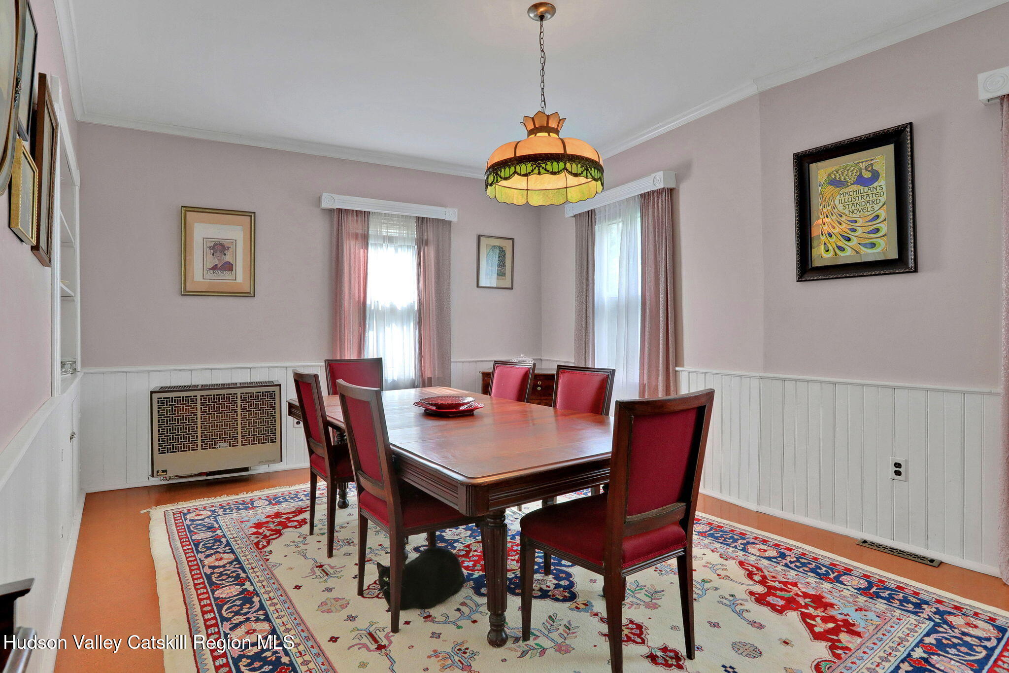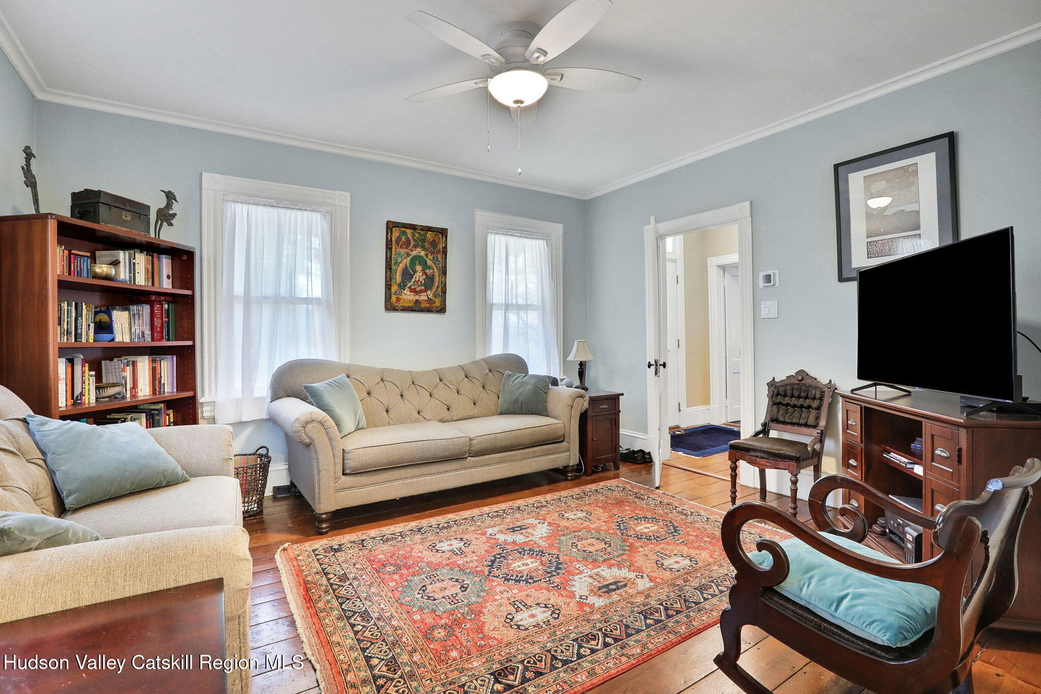This beautiful Victorian home retains its old-world charm inside and out, yet it's been so well cared for, you'll have little to do to maintain it. Inside, you'll find striking wide-board pine flooring, classic decorative trim, built-in cabinets, and original doors and hardware. The home has comfortably spacious rooms, a full bath on each floor, a well-equipped working kitchen with a lovely breakfast area, and a full dry basement. Outside, enjoy the front porch entry, pretty storybook details, bay windows and second story turret. This turret enhances the primary bedroom with a cozy office space or reading nook. The second floor also hosts three other bedrooms, a bathroom with tub, and access to the gorgeous untouched full attic to use as you wish. The first floor offers spacious rooms for separate living and dining, plus a den and full bathroom with shower. If need be, the den can be easily turned into a sleeping room or private office by closing one of two doorways. The grounds are beautifully landscaped with lush gardens, an inviting covered patio that makes a great outdoor room with a feeling of privacy, and a cute outbuilding. This well-maintained home was recently painted and has a new central heat pump plus a new oil furnace for backup. The garage roof is recent, and the garage offers a full second story that would make a great studio or accessory dwelling unit, now encouraged by the town. Rumor has it that this home's storied past includes hosting both the Tillson post office and a millinery shop. Now it's a wonderful home in the friendly hamlet of Tillson where you can be mere steps from the hugely popular Darlings Roadhouse, less than two miles from Rosendale's quaint Main Street, and a short drive to New Paltz or Kingston. Catch the NYC bus one short block away. It's really a super location.