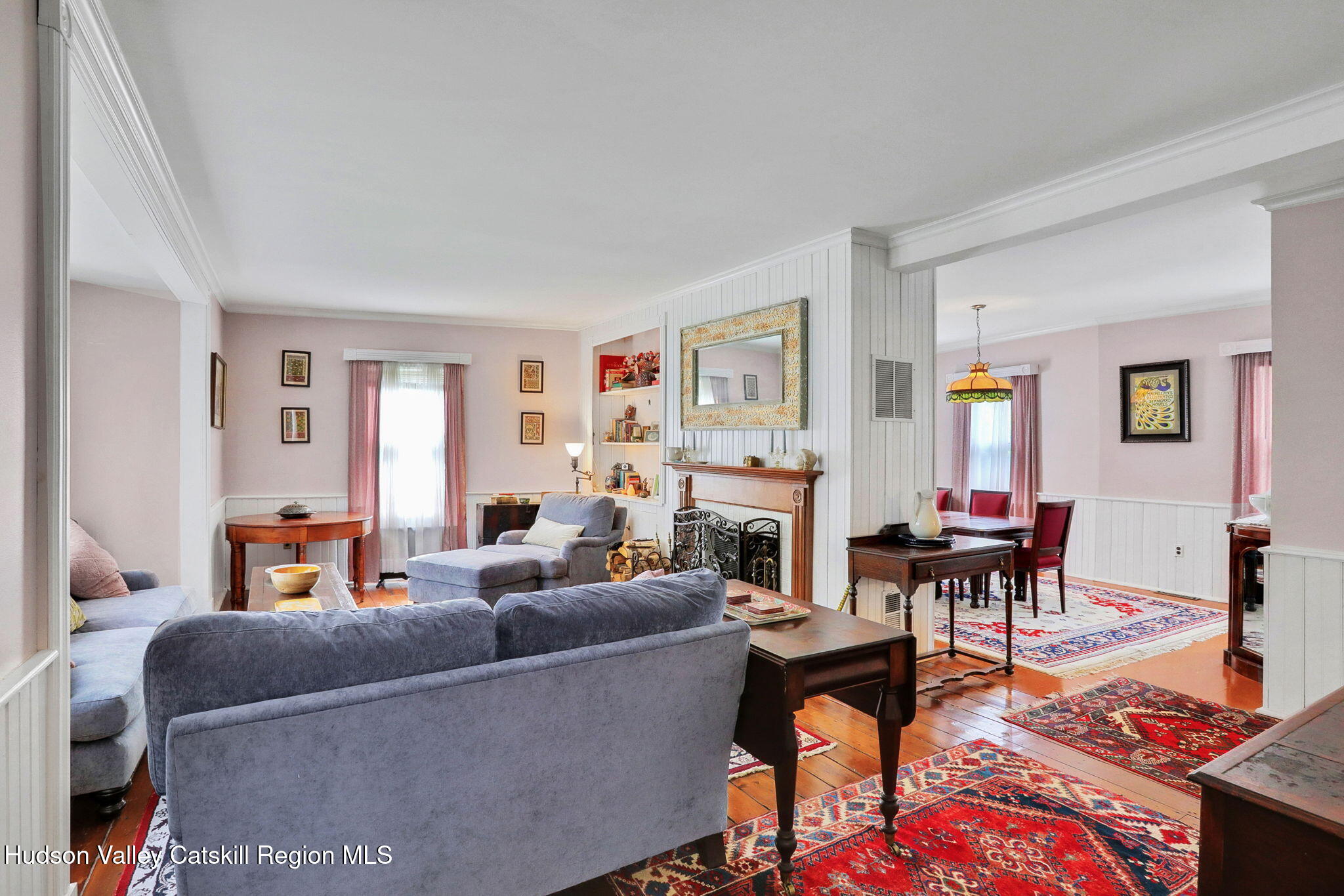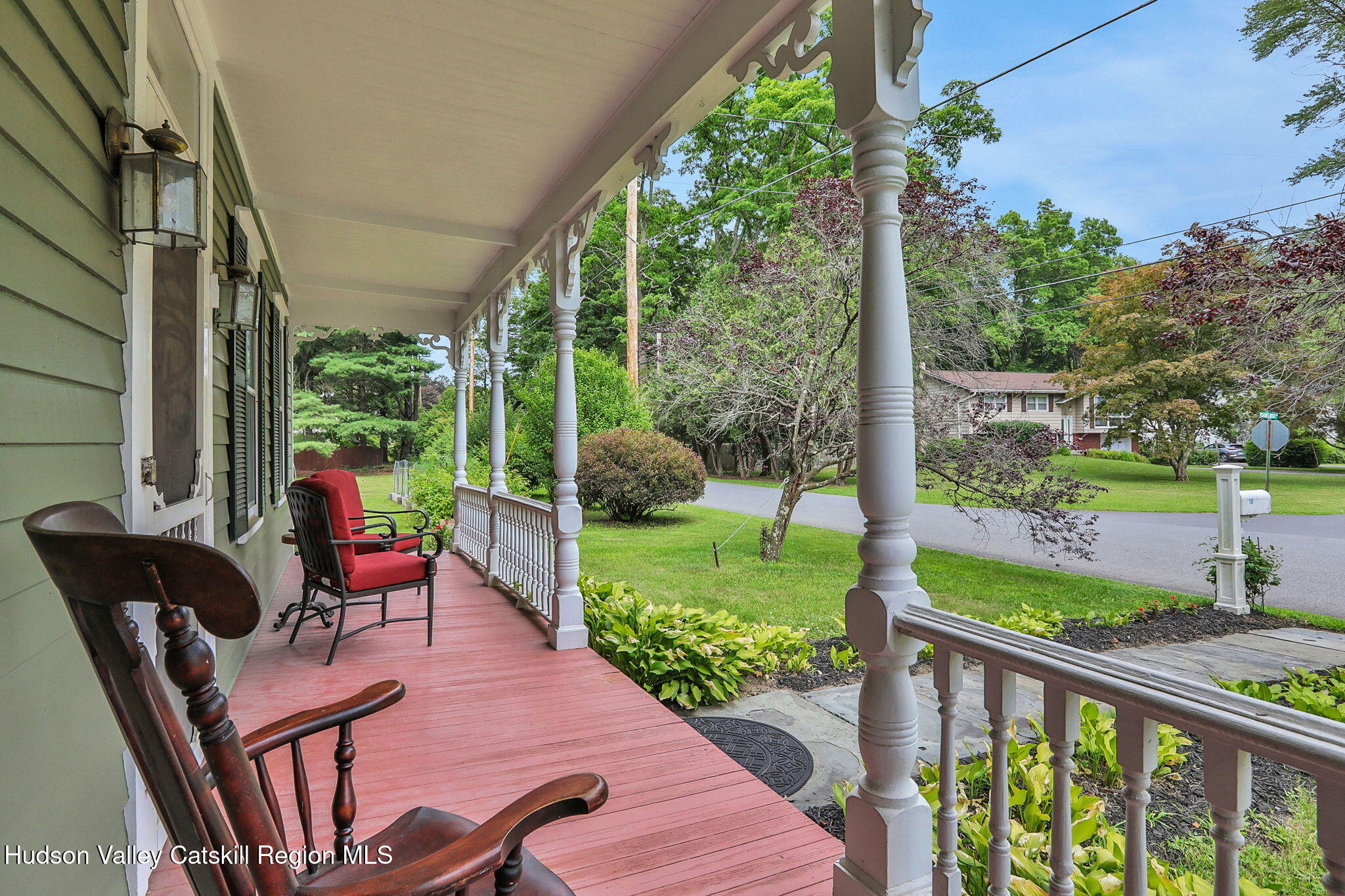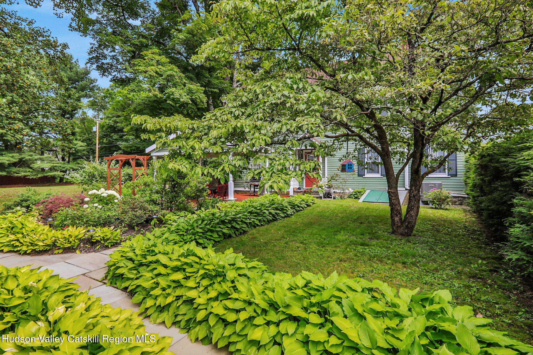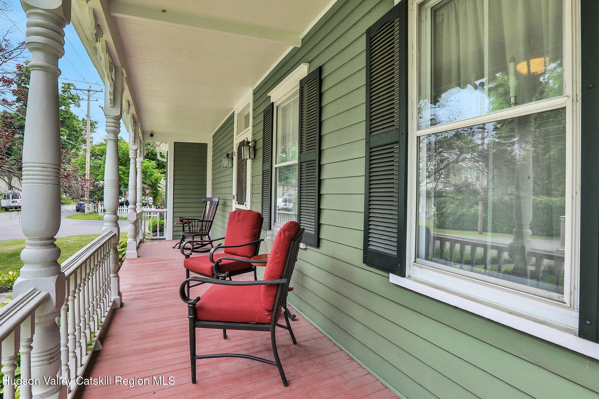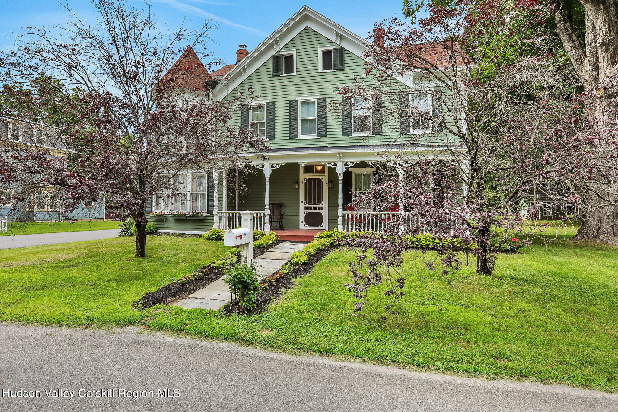 This beautiful Victorian home retains its old-world charm inside and out, yet it's been so well cared for, you'll have little to do to maintain it. Inside, you'll find striking wide-board pine flooring, classic decorative trim, built-in cabinets, and original doors and hardware. The home has comfortably spacious rooms, a full bath on each floor, a well-equipped working kitchen with a lovely breakfast area, and a full dry basement. Outside, enjoy the front porch entry, pretty storybook details, bay windows and second story turret. This turret enhances the primary bedroom with a cozy office space or reading nook. The second floor also hosts three other bedrooms, a bathroom with tub, and access to the gorgeous untouched full attic to use as you wish. The first floor offers spacious rooms for separate living and dining, plus a den and full bathroom with shower. If need be, the den can be easily turned into a sleeping room or private office by closing one of two doorways. The grounds are beautifully landscaped with lush gardens, an inviting covered patio that makes a great outdoor room with a feeling of privacy, and a cute outbuilding. This well-maintained home was recently painted and has a new central heat pump plus a new oil furnace for backup. The garage roof is recent, and the garage offers a full second story that would make a great studio or accessory dwelling unit, now encouraged by the town. Rumor has it that this home's storied past includes hosting both the Tillson post office and a millinery shop. Now it's a wonderful home in the friendly hamlet of Tillson where you can be mere steps from the hugely popular Darlings Roadhouse, less than two miles from Rosendale's quaint Main Street, and a short drive to New Paltz or Kingston. Catch the NYC bus one short block away. It's really a super location.
