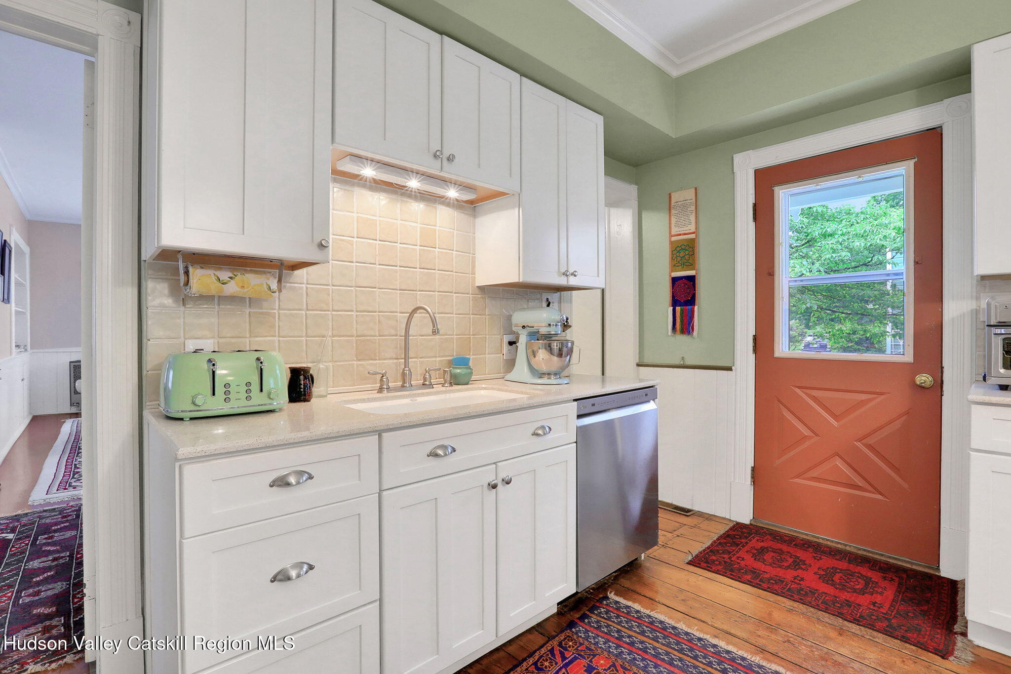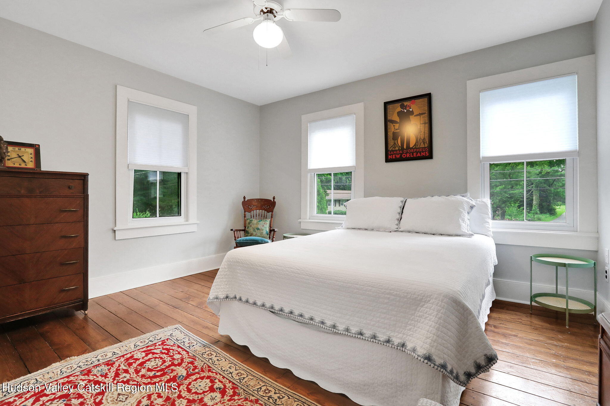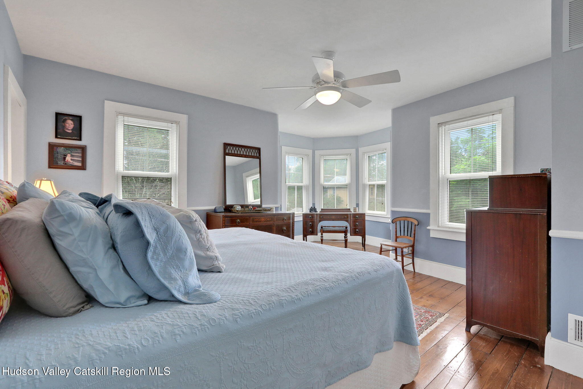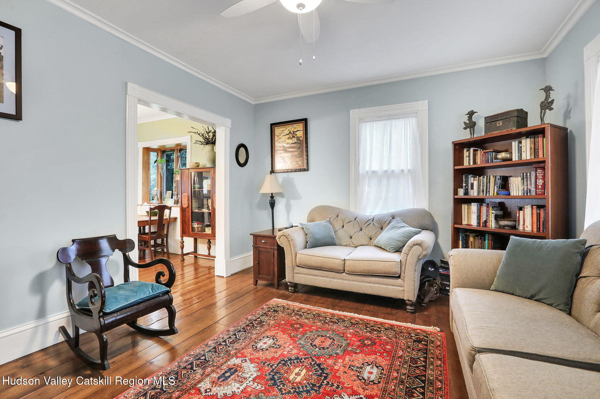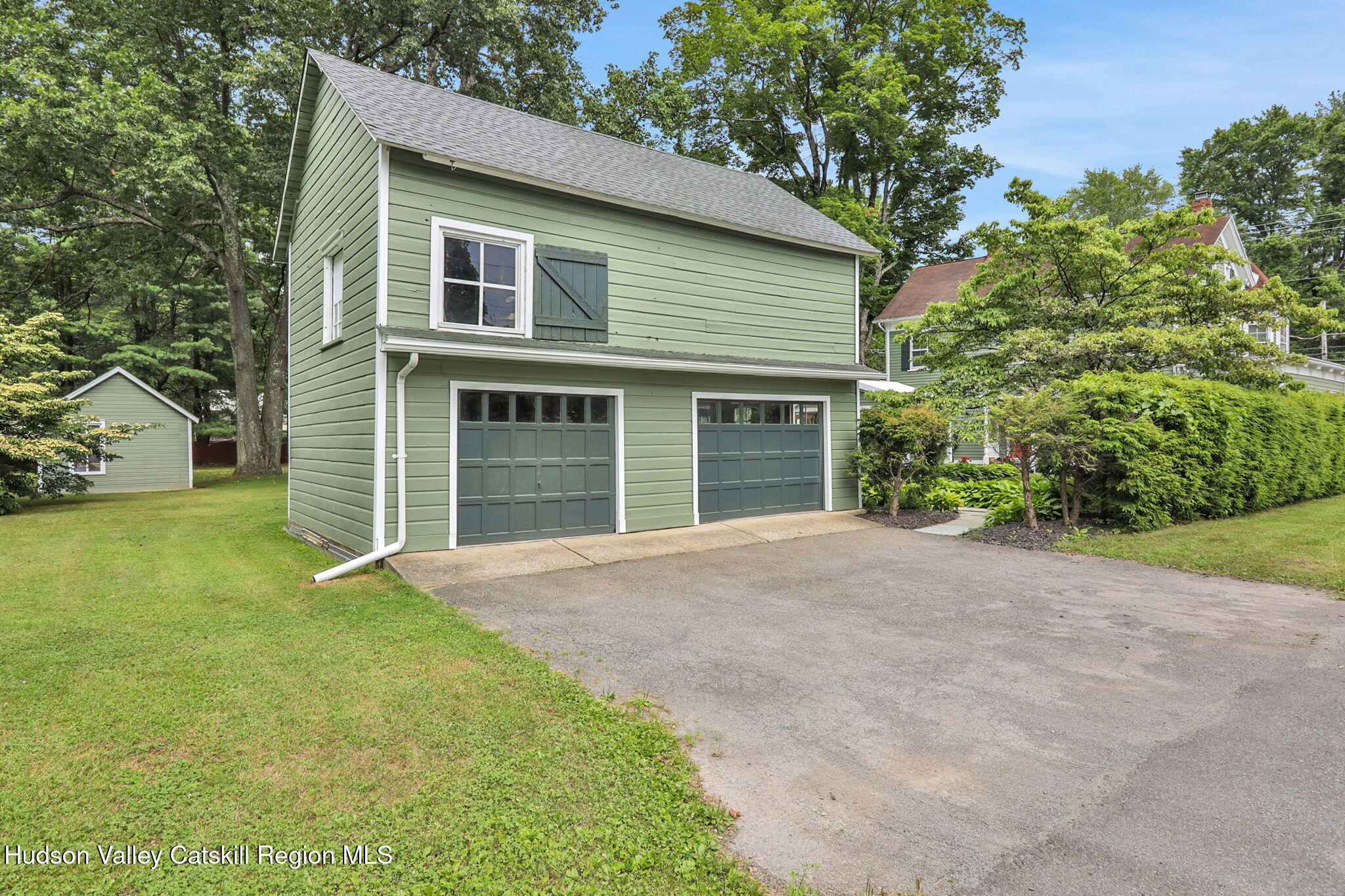 This beautiful Victorian home retains its old-world charm inside and out, yet it's been so well cared for, you'll have little to do to maintain it. Inside, you'll find striking wide-board pine flooring, classic decorative trim, built-in cabinets, and original doors and hardware. The home has comfortably spacious rooms, a full bath on each floor, a well-equipped working kitchen with a lovely breakfast area, and a full dry basement. Outside, enjoy the front porch entry, pretty storybook details, bay windows and second story turret. This turret enhances the primary bedroom with a cozy office space or reading nook. The second floor also hosts three other bedrooms, a bathroom with tub, and access to the gorgeous untouched full attic to use as you wish. The first floor offers spacious rooms for separate living and dining, plus a den and full bathroom with shower. If need be, the den can be easily turned into a sleeping room or private office by closing one of two doorways. The grounds are beautifully landscaped with lush gardens, an inviting covered patio that makes a great outdoor room with a feeling of privacy, and a cute outbuilding. This well-maintained home was recently painted and has a new central heat pump plus a new oil furnace for backup. The garage roof is recent, and the garage offers a full second story that would make a great studio or accessory dwelling unit, now encouraged by the town. Rumor has it that this home's storied past includes hosting both the Tillson post office and a millinery shop. Now it's a wonderful home in the friendly hamlet of Tillson where you can be mere steps from the hugely popular Darlings Roadhouse, less than two miles from Rosendale's quaint Main Street, and a short drive to New Paltz or Kingston. Catch the NYC bus one short block away. It's really a super location.