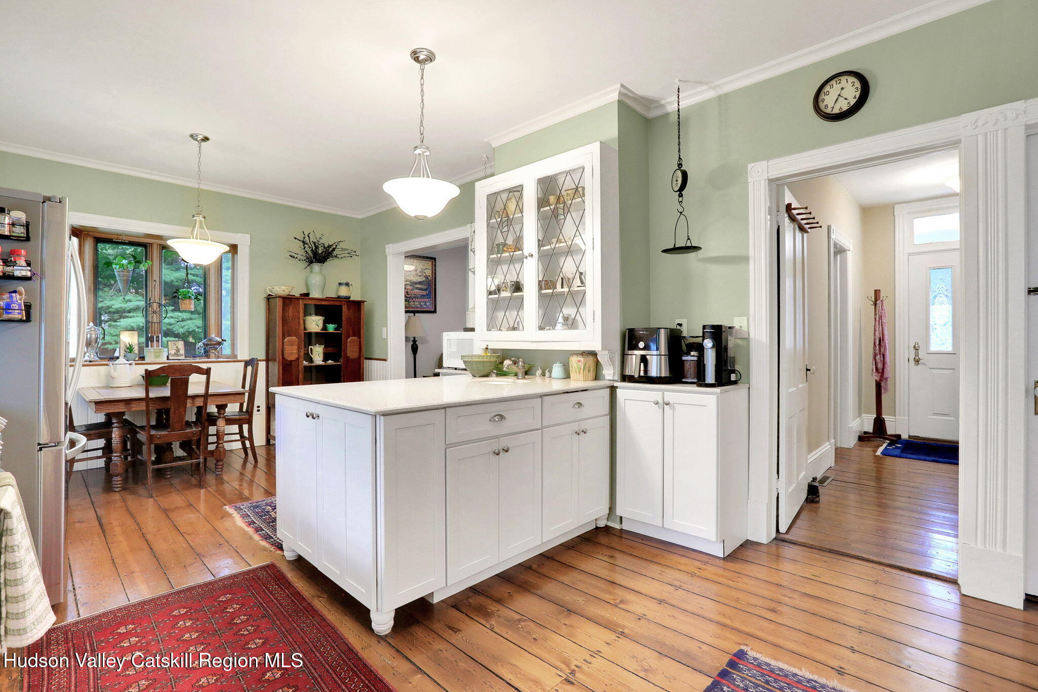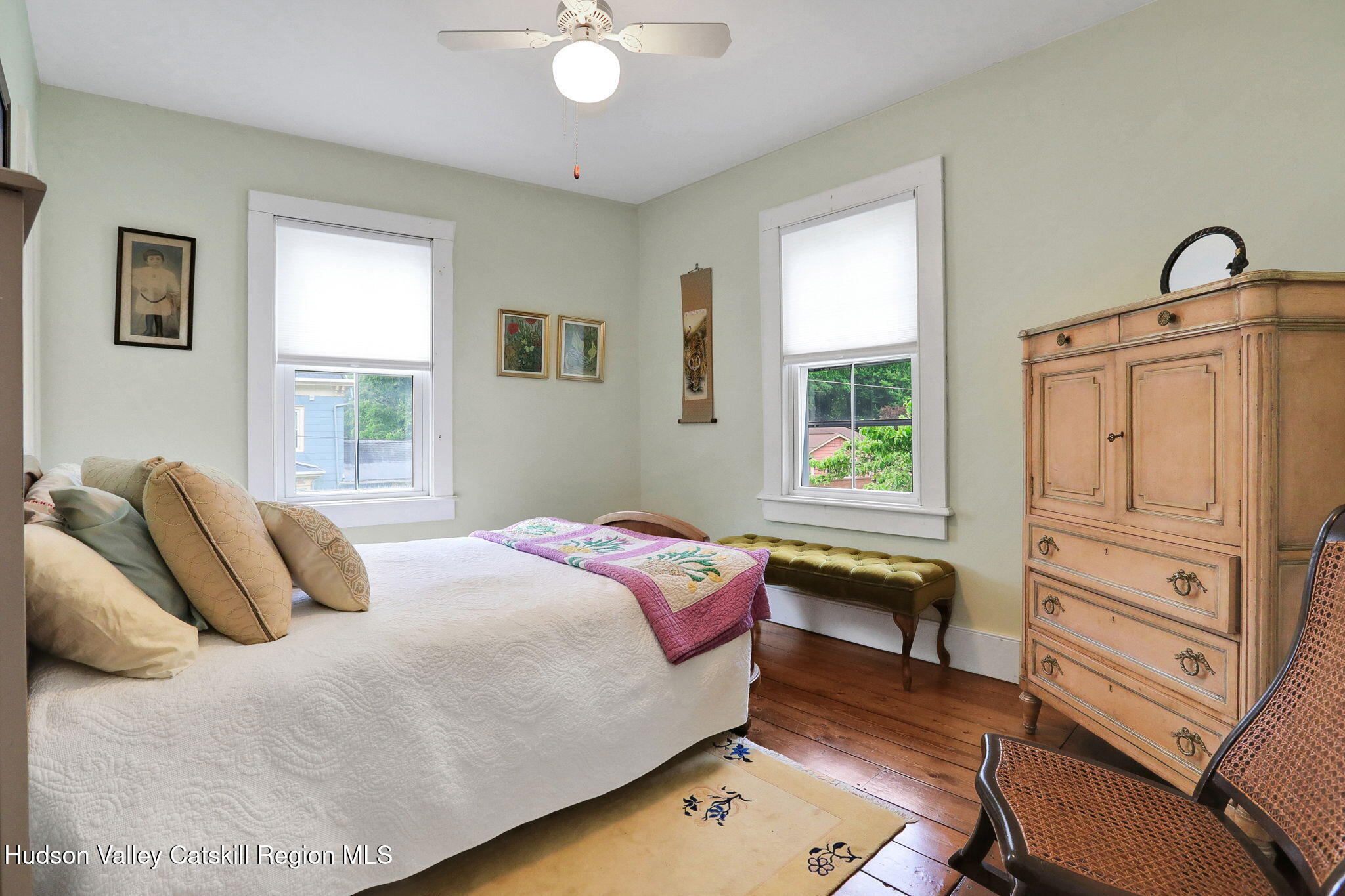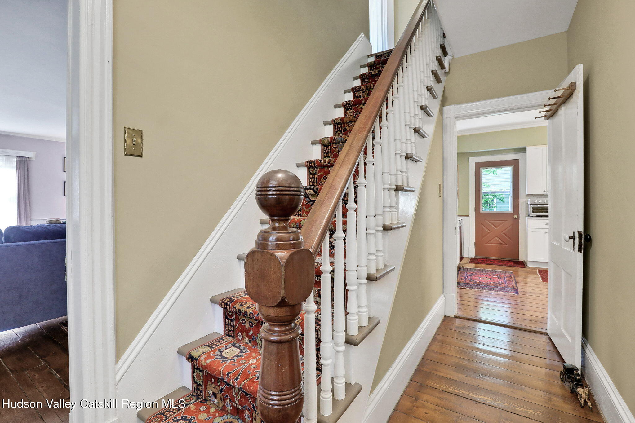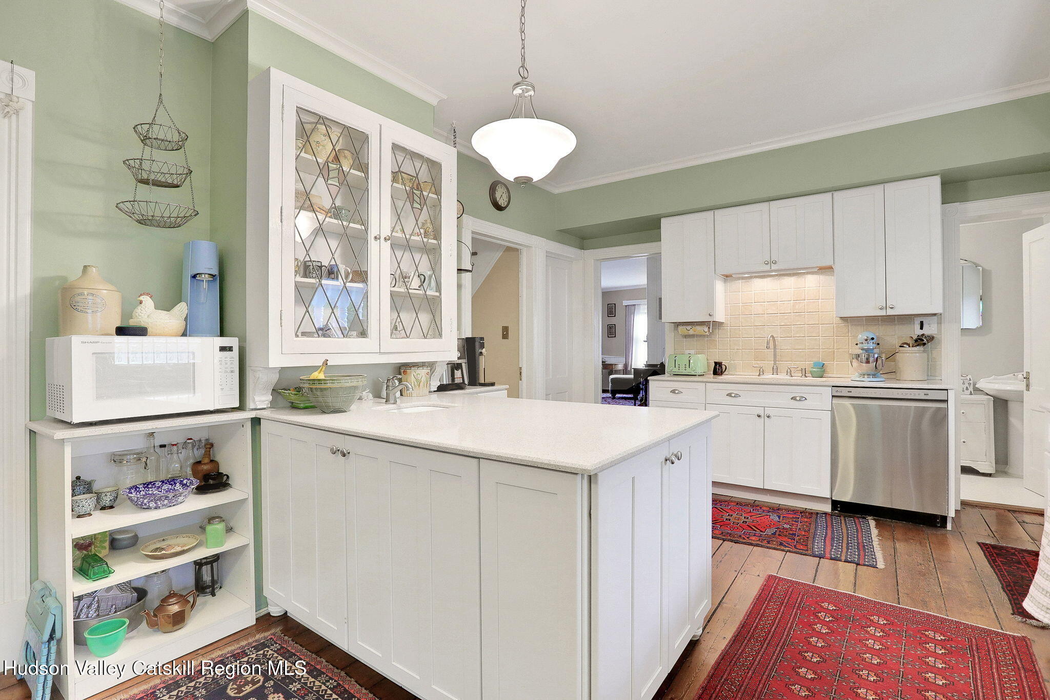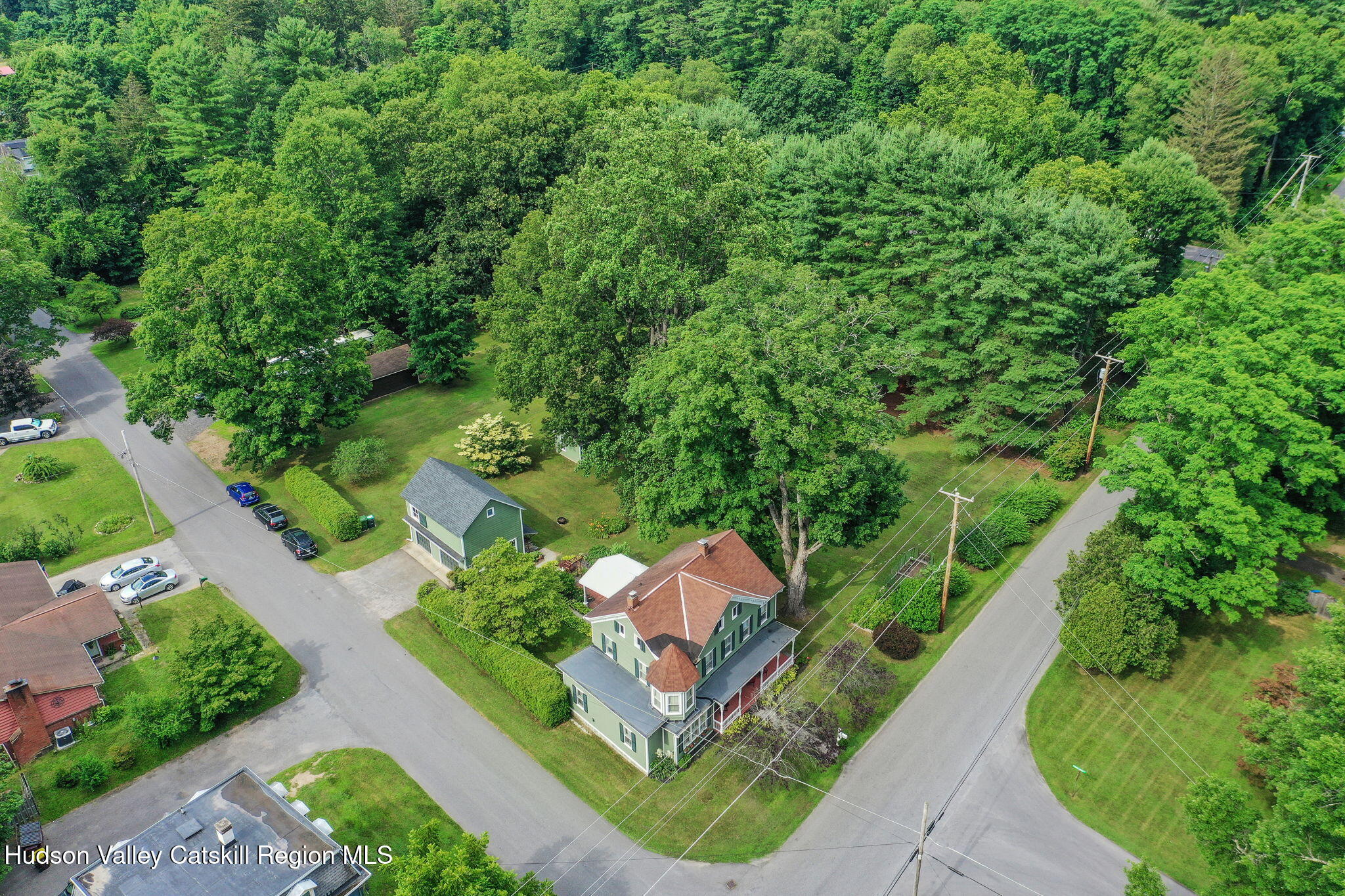 This beautiful Victorian home retains its old-world charm inside and out, yet it's been so well cared for, you'll have little to do to maintain it. Inside, you'll find striking wide-board pine flooring, classic decorative trim, built-in cabinets, and original doors and hardware. The home has comfortably spacious rooms, a full bath on each floor, a well-equipped working kitchen with a lovely breakfast area, and a full dry basement. Outside, enjoy the front porch entry, pretty storybook details, bay windows and second story turret. This turret enhances the primary bedroom with a cozy office space or reading nook. The second floor also hosts three other bedrooms, a bathroom with tub, and access to the gorgeous untouched full attic to use as you wish. The first floor offers spacious rooms for separate living and dining, plus a den and full bathroom with shower. If need be, the den can be easily turned into a sleeping room or private office by closing one of two doorways. The grounds are beautifully landscaped with lush gardens, an inviting covered patio that makes a great outdoor room with a feeling of privacy, and a cute outbuilding. This well-maintained home was recently painted and has a new central heat pump plus a new oil furnace for backup. The garage roof is recent, and the garage offers a full second story that would make a great studio or accessory dwelling unit, now encouraged by the town. Rumor has it that this home's storied past includes hosting both the Tillson post office and a millinery shop. Now it's a wonderful home in the friendly hamlet of Tillson where you can be mere steps from the hugely popular Darlings Roadhouse, less than two miles from Rosendale's quaint Main Street, and a short drive to New Paltz or Kingston. Catch the NYC bus one short block away. It's really a super location.
