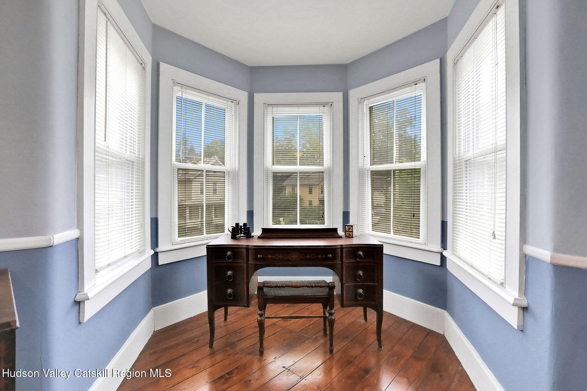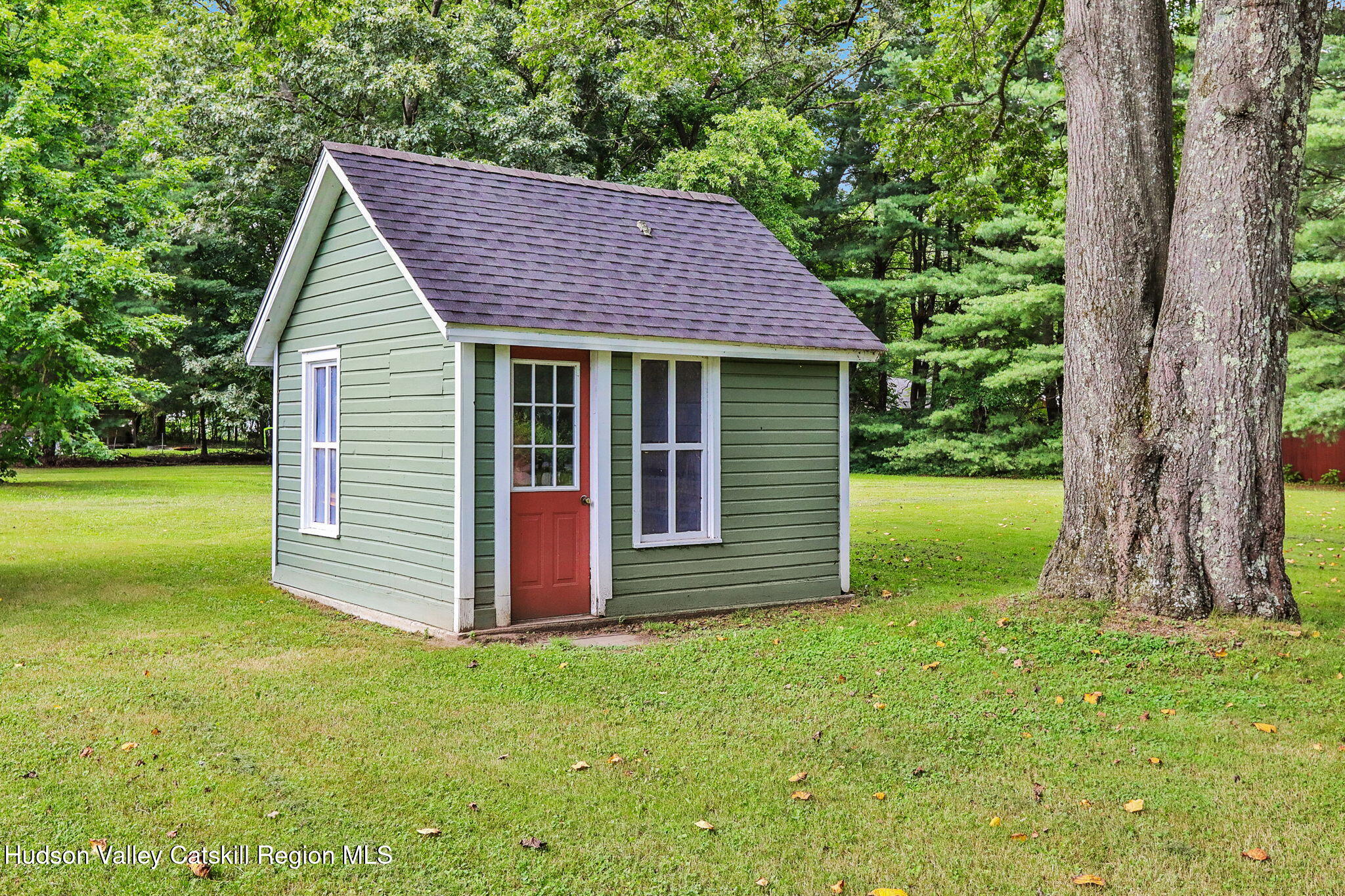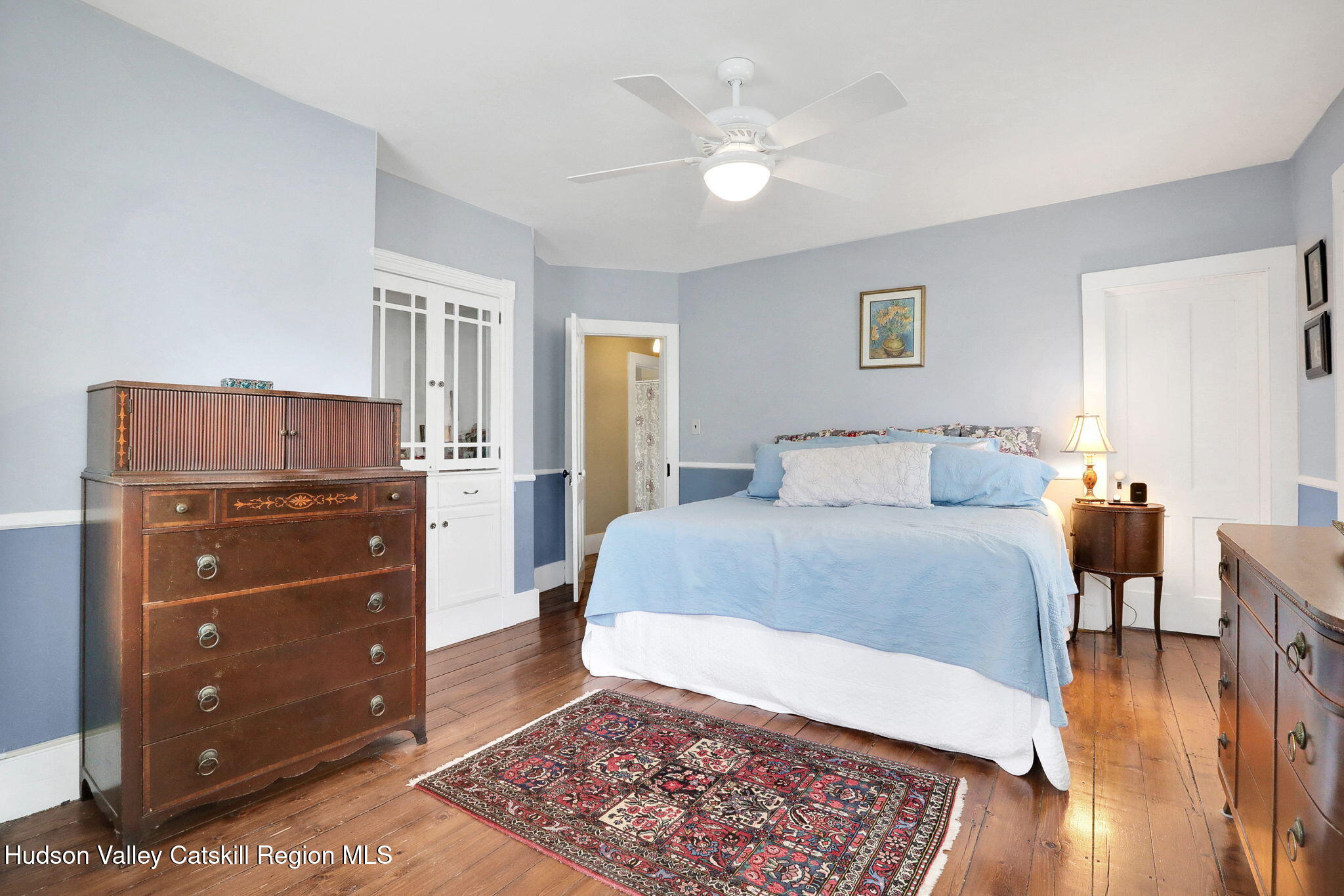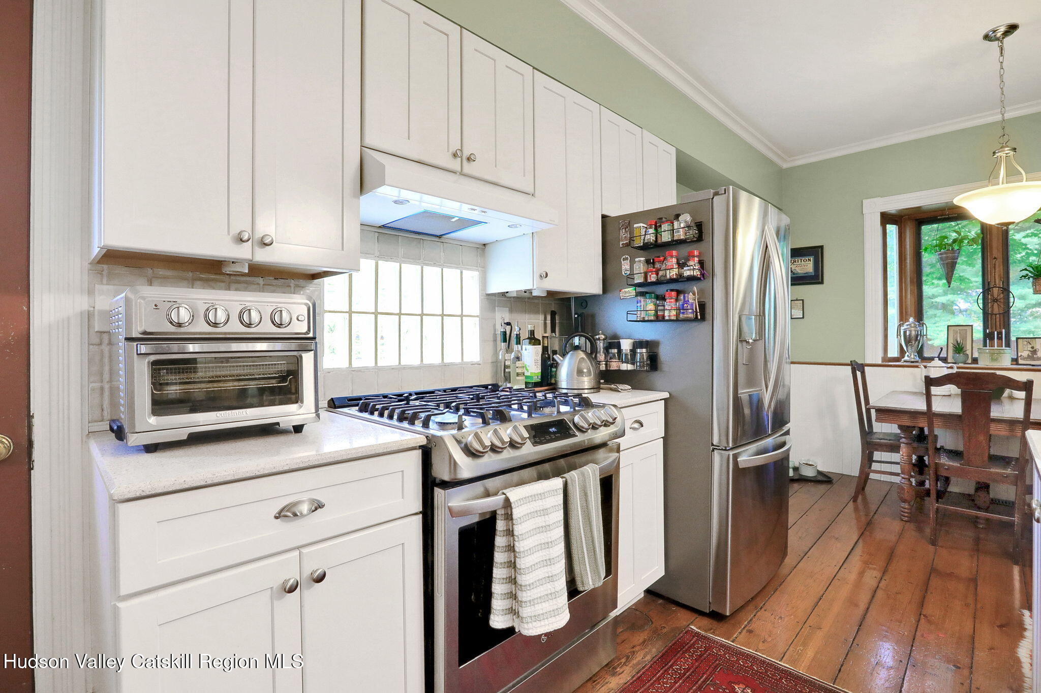This beautiful Victorian home retains its old-world charm inside and out, yet it's been so well cared for, you'll have little to do to maintain it. Inside, you'll find striking wide-board pine flooring, classic decorative trim, built-in cabinets, and original doors and hardware. The home has comfortably spacious rooms, a full bath on each floor, a well-equipped working kitchen with a lovely breakfast area, and a full dry basement. Outside, enjoy the front porch entry, pretty storybook details, bay windows and second story turret. This turret enhances the primary bedroom with a cozy office space or reading nook. The second floor also hosts three other bedrooms, a bathroom with tub, and access to the gorgeous untouched full attic to use as you wish. The first floor offers spacious rooms for separate living and dining, plus a den and full bathroom with shower. If need be, the den can be easily turned into a sleeping room or private office by closing one of two doorways. The grounds are beautifully landscaped with lush gardens, an inviting covered patio that makes a great outdoor room with a feeling of privacy, and a cute outbuilding. This well-maintained home was recently painted and has a new central heat pump plus a new oil furnace for backup. The garage roof is recent, and the garage offers a full second story that would make a great studio or accessory dwelling unit, now encouraged by the town. Rumor has it that this home's storied past includes hosting both the Tillson post office and a millinery shop. Now it's a wonderful home in the friendly hamlet of Tillson where you can be mere steps from the hugely popular Darlings Roadhouse, less than two miles from Rosendale's quaint Main Street, and a short drive to New Paltz or Kingston. Catch the NYC bus one short block away. It's really a super location.
