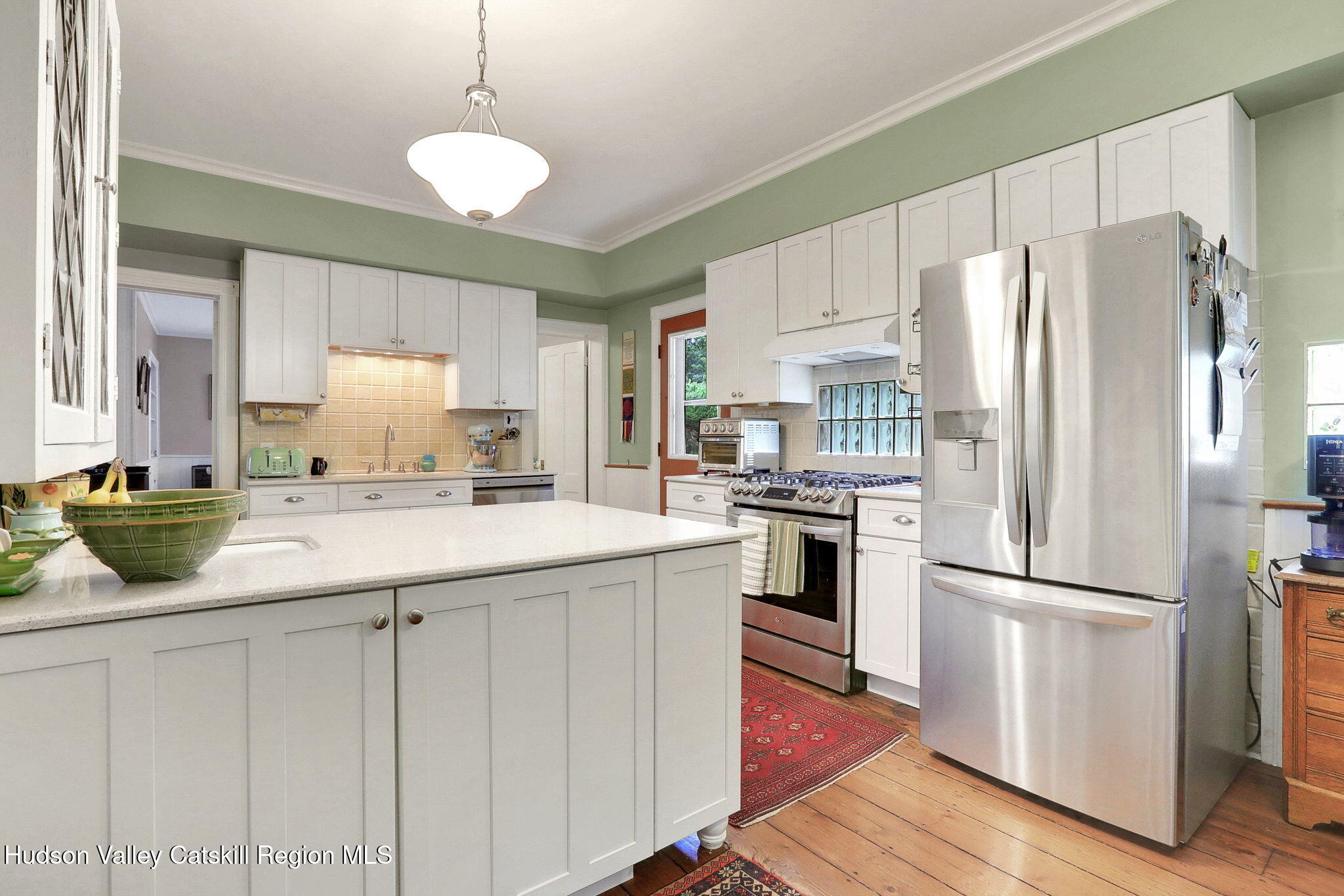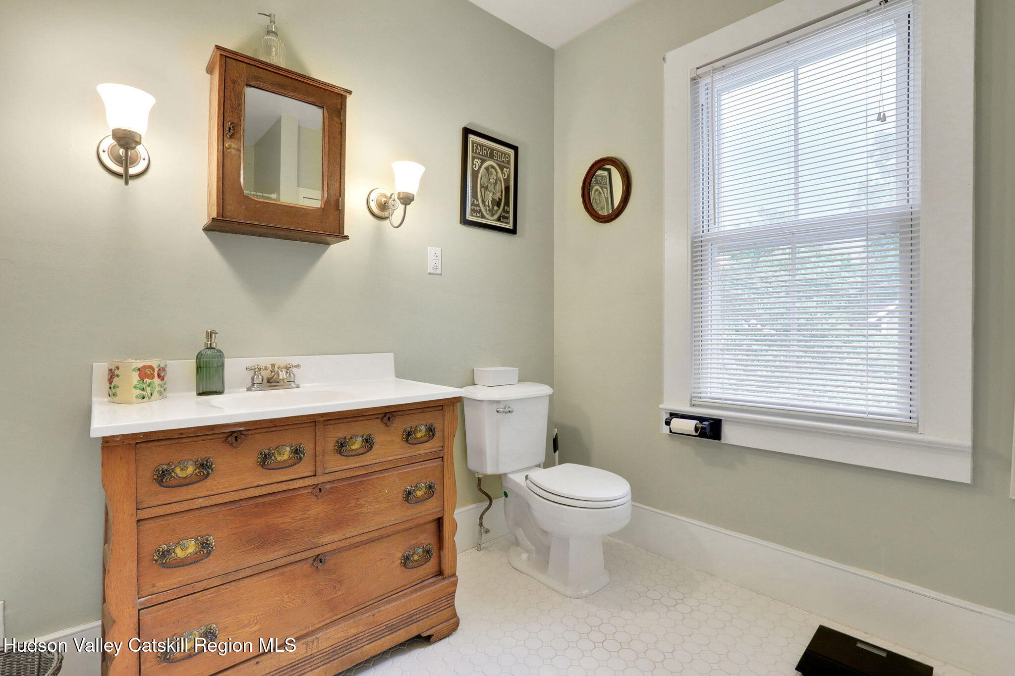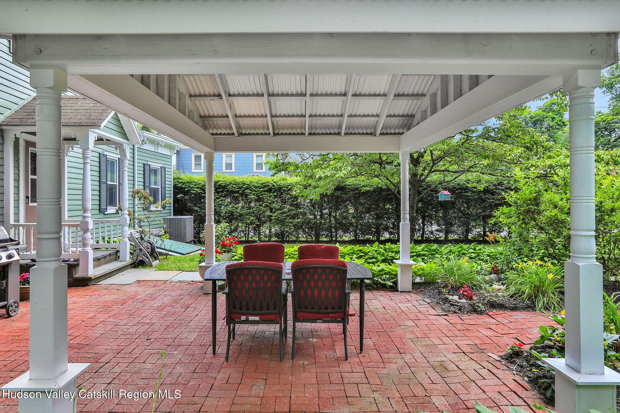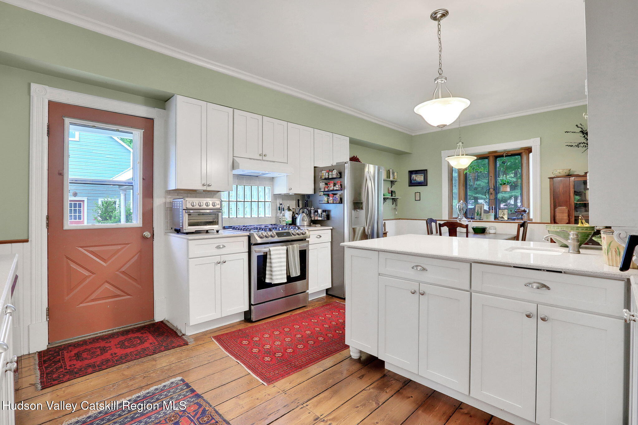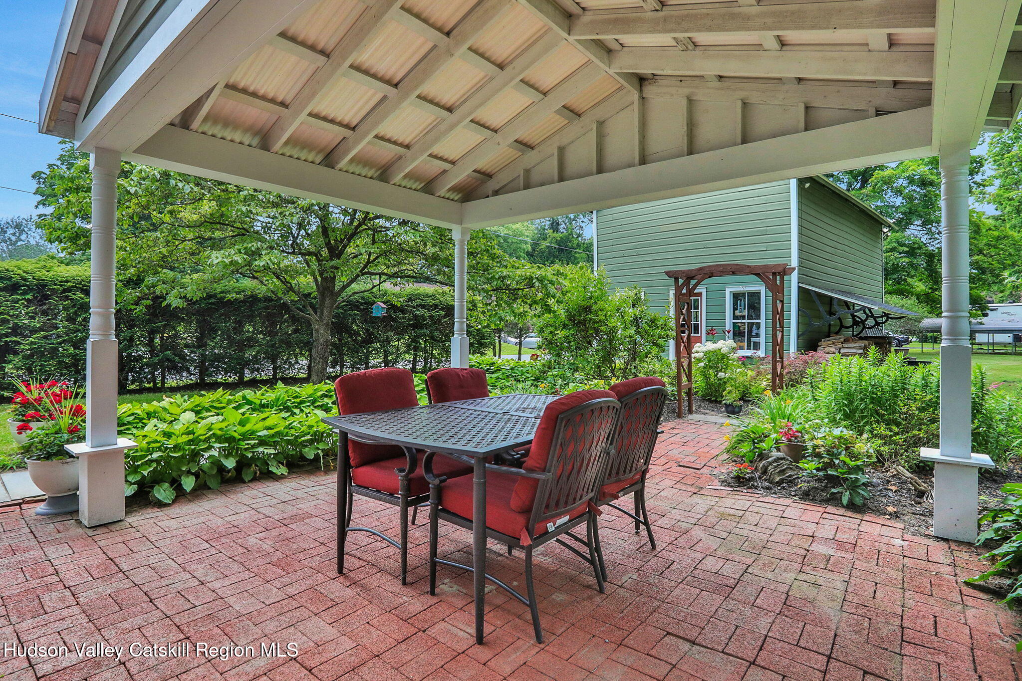 This beautiful Victorian home retains its old-world charm inside and out, yet it's been so well cared for, you'll have little to do to maintain it. Inside, you'll find striking wide-board pine flooring, classic decorative trim, built-in cabinets, and original doors and hardware. The home has comfortably spacious rooms, a full bath on each floor, a well-equipped working kitchen with a lovely breakfast area, and a full dry basement. Outside, enjoy the front porch entry, pretty storybook details, bay windows and second story turret. This turret enhances the primary bedroom with a cozy office space or reading nook. The second floor also hosts three other bedrooms, a bathroom with tub, and access to the gorgeous untouched full attic to use as you wish. The first floor offers spacious rooms for separate living and dining, plus a den and full bathroom with shower. If need be, the den can be easily turned into a sleeping room or private office by closing one of two doorways. The grounds are beautifully landscaped with lush gardens, an inviting covered patio that makes a great outdoor room with a feeling of privacy, and a cute outbuilding. This well-maintained home was recently painted and has a new central heat pump plus a new oil furnace for backup. The garage roof is recent, and the garage offers a full second story that would make a great studio or accessory dwelling unit, now encouraged by the town. Rumor has it that this home's storied past includes hosting both the Tillson post office and a millinery shop. Now it's a wonderful home in the friendly hamlet of Tillson where you can be mere steps from the hugely popular Darlings Roadhouse, less than two miles from Rosendale's quaint Main Street, and a short drive to New Paltz or Kingston. Catch the NYC bus one short block away. It's really a super location.