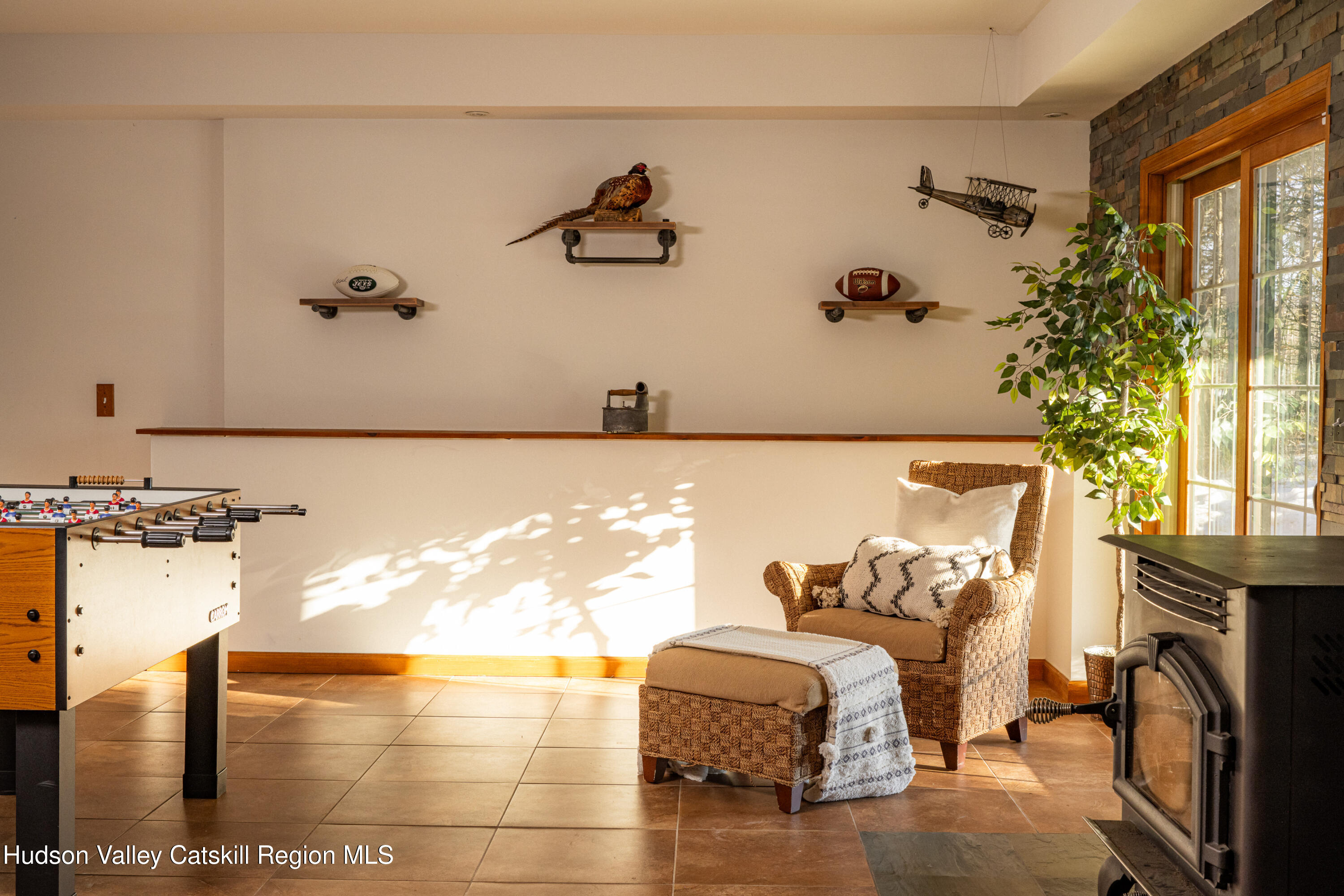 The upper level features a spacious primary en-suite wing, along with additional bedrooms and a second full bathroom, separated by an open loft overlooking the main living space. The main level offers bedrooms and bathrooms positioned on either side of the home, providing balance and privacy. The lower level is dedicated to recreation and leisure, with a secondary living room, pool table, foosball table, full bar, and pellet stove, creating a self-contained area well suited to entertaining or extended family use.