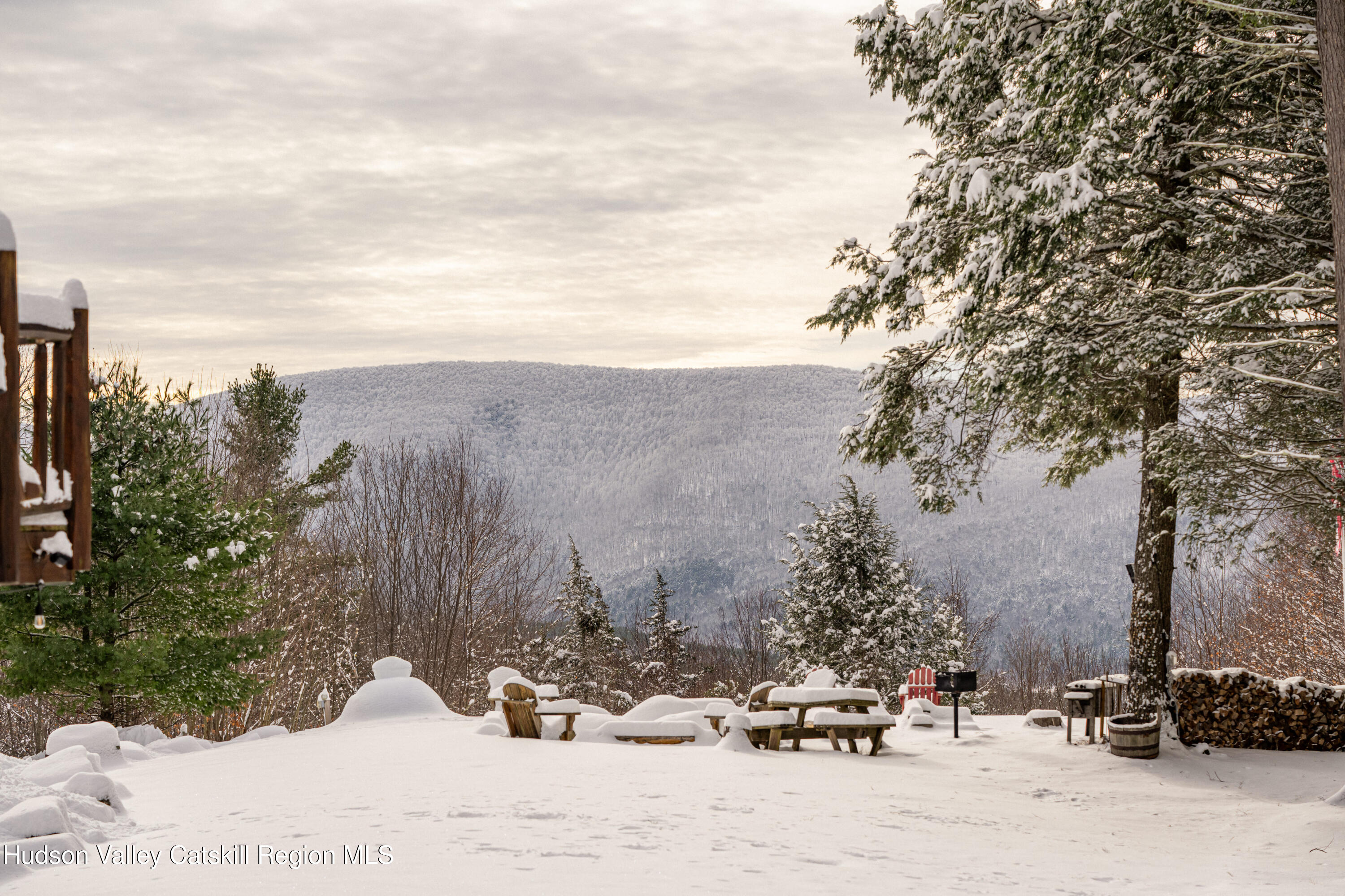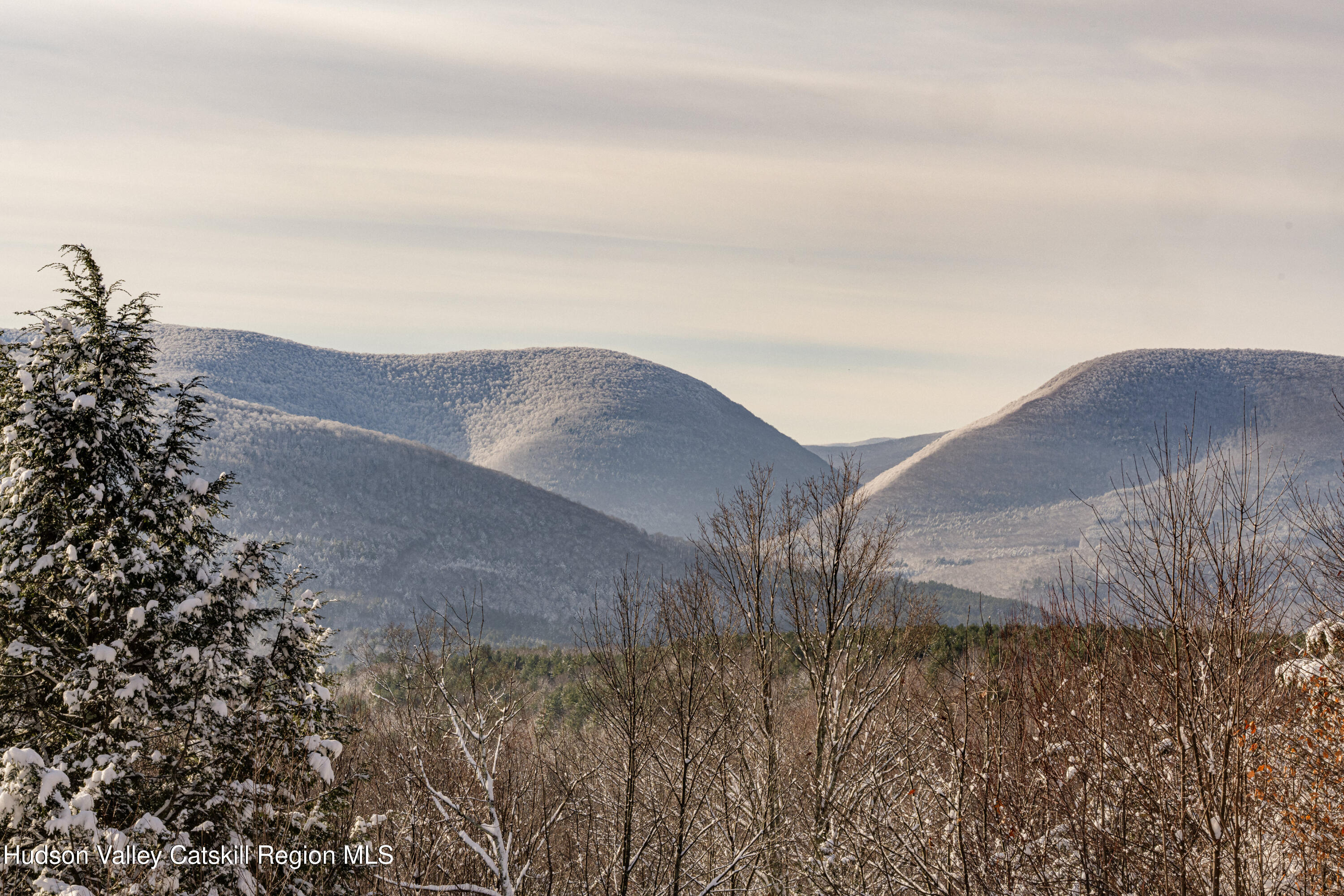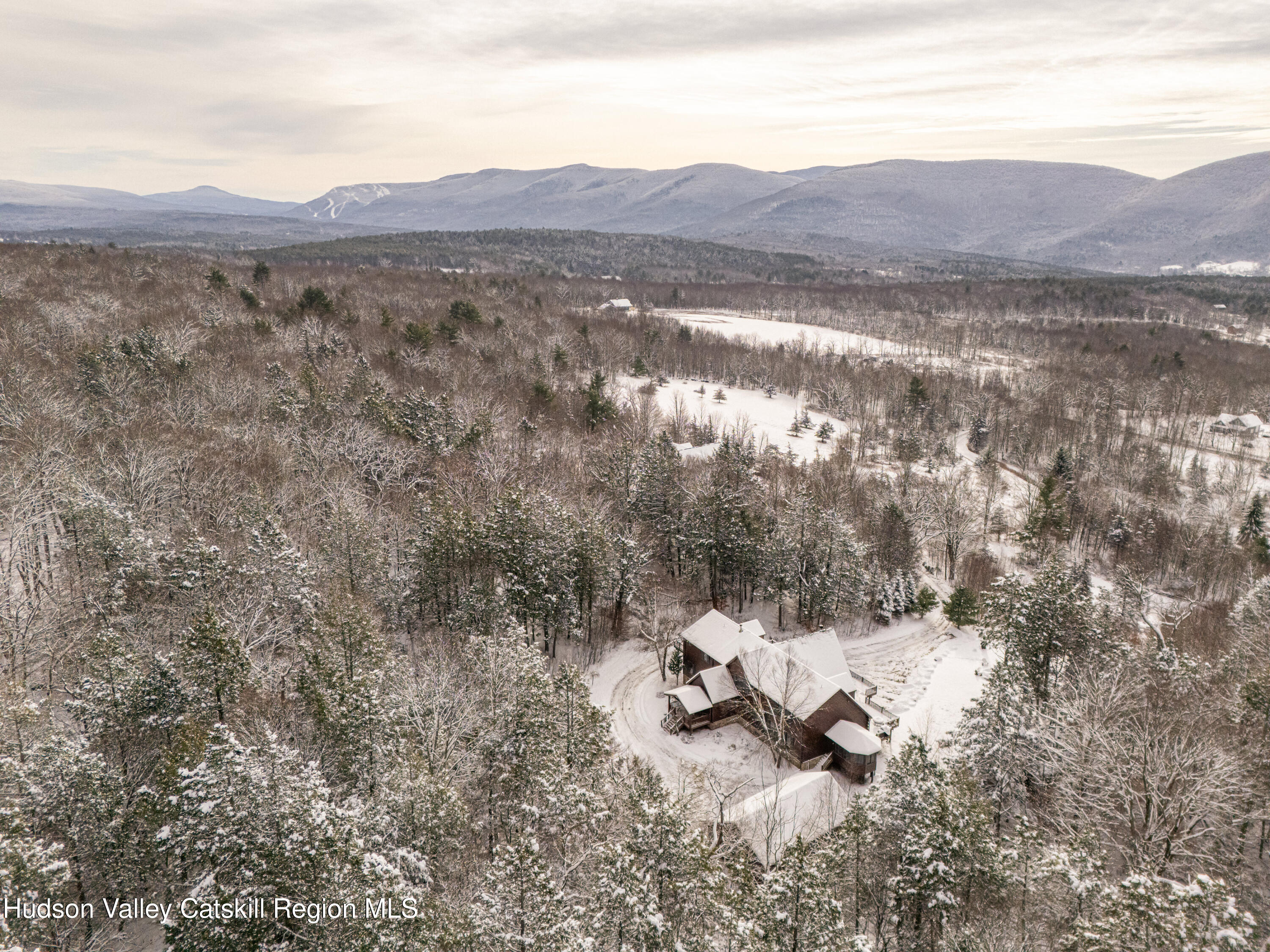 Set on a private mountainside in the Catskills village of Lexington, this expansive log home enjoys open, long-distance views directly into one of the Catskills' most dramatic mountain passes, defined by steep ridgelines and a broad notch that changes visibly with weather and season.