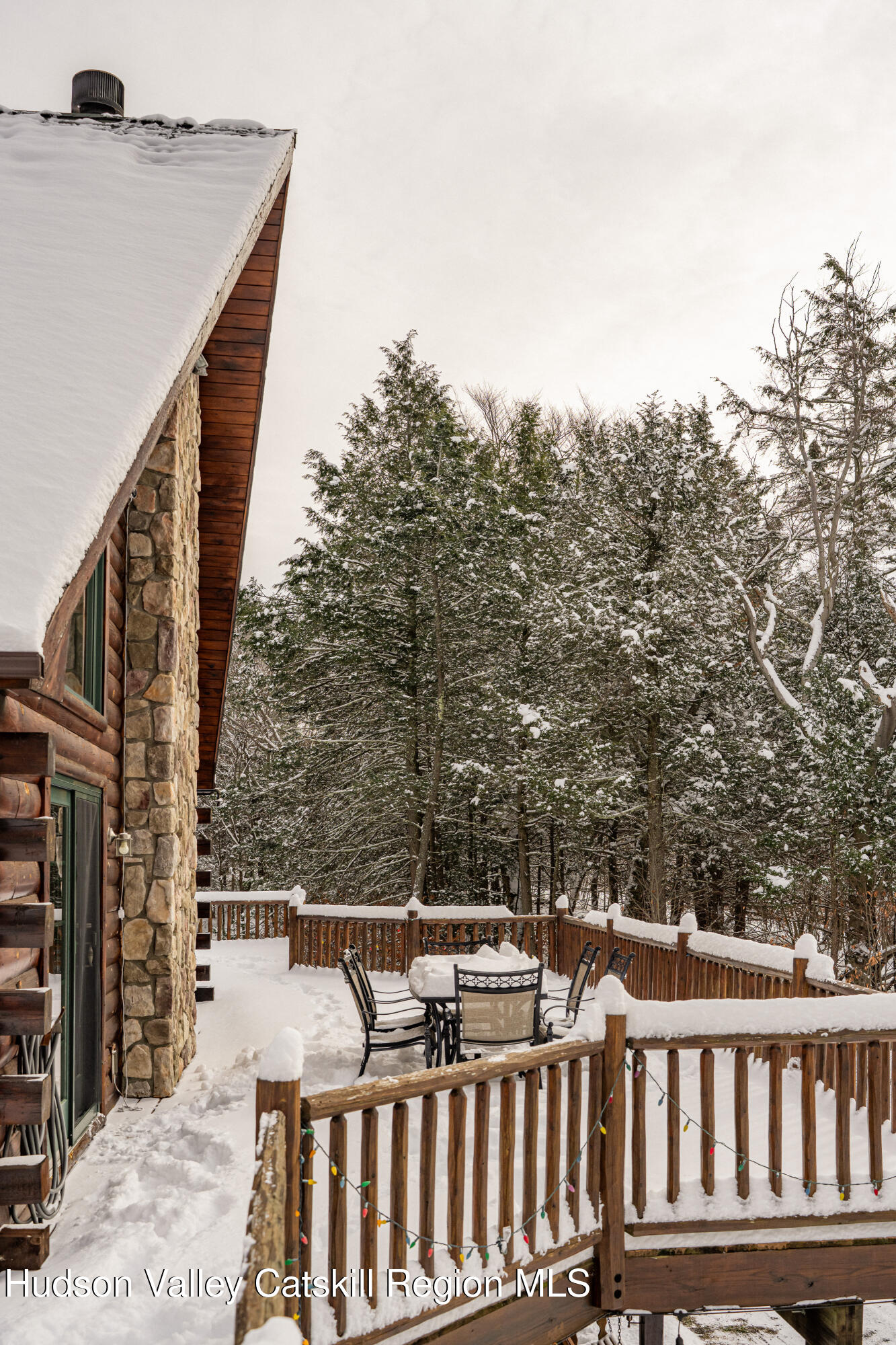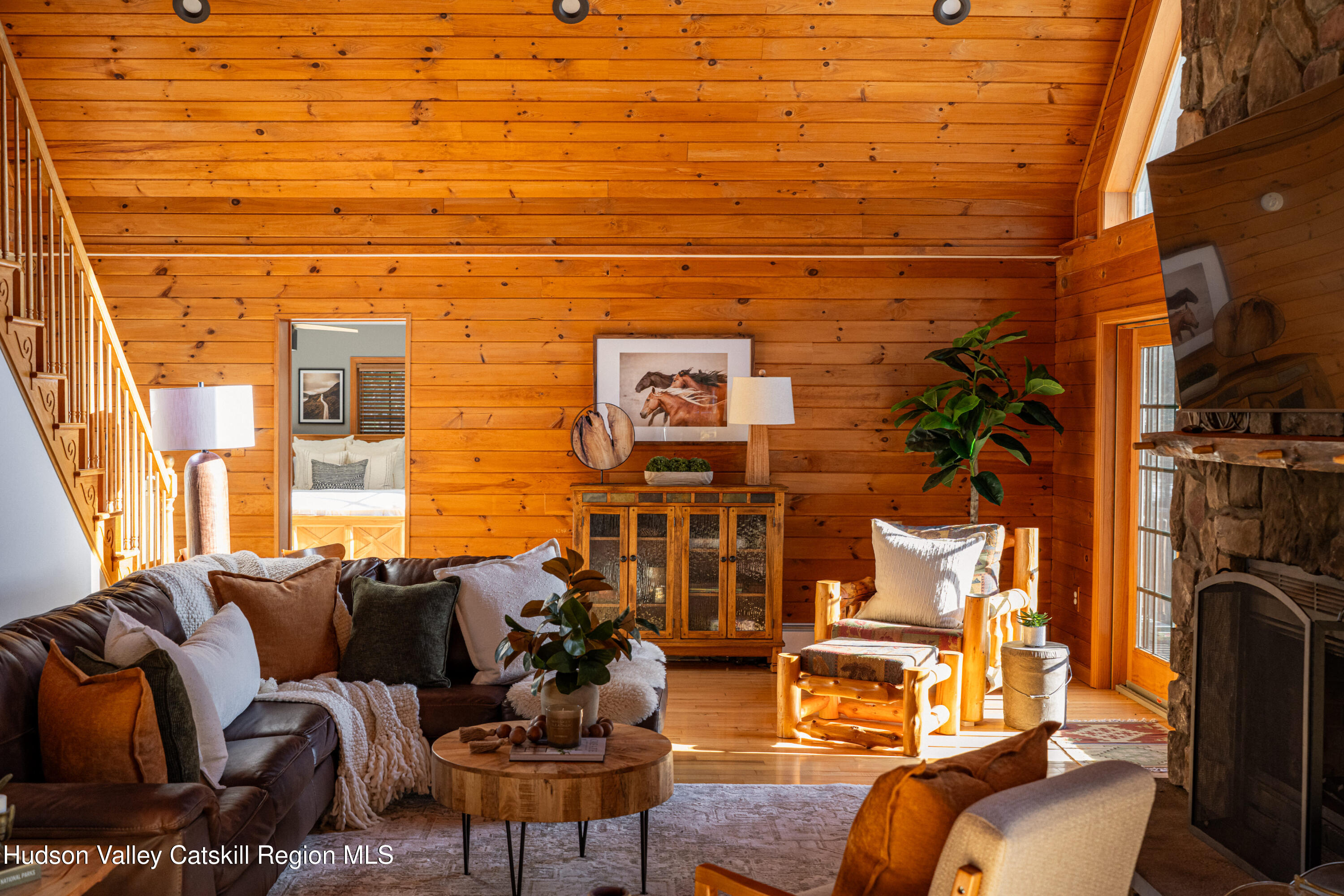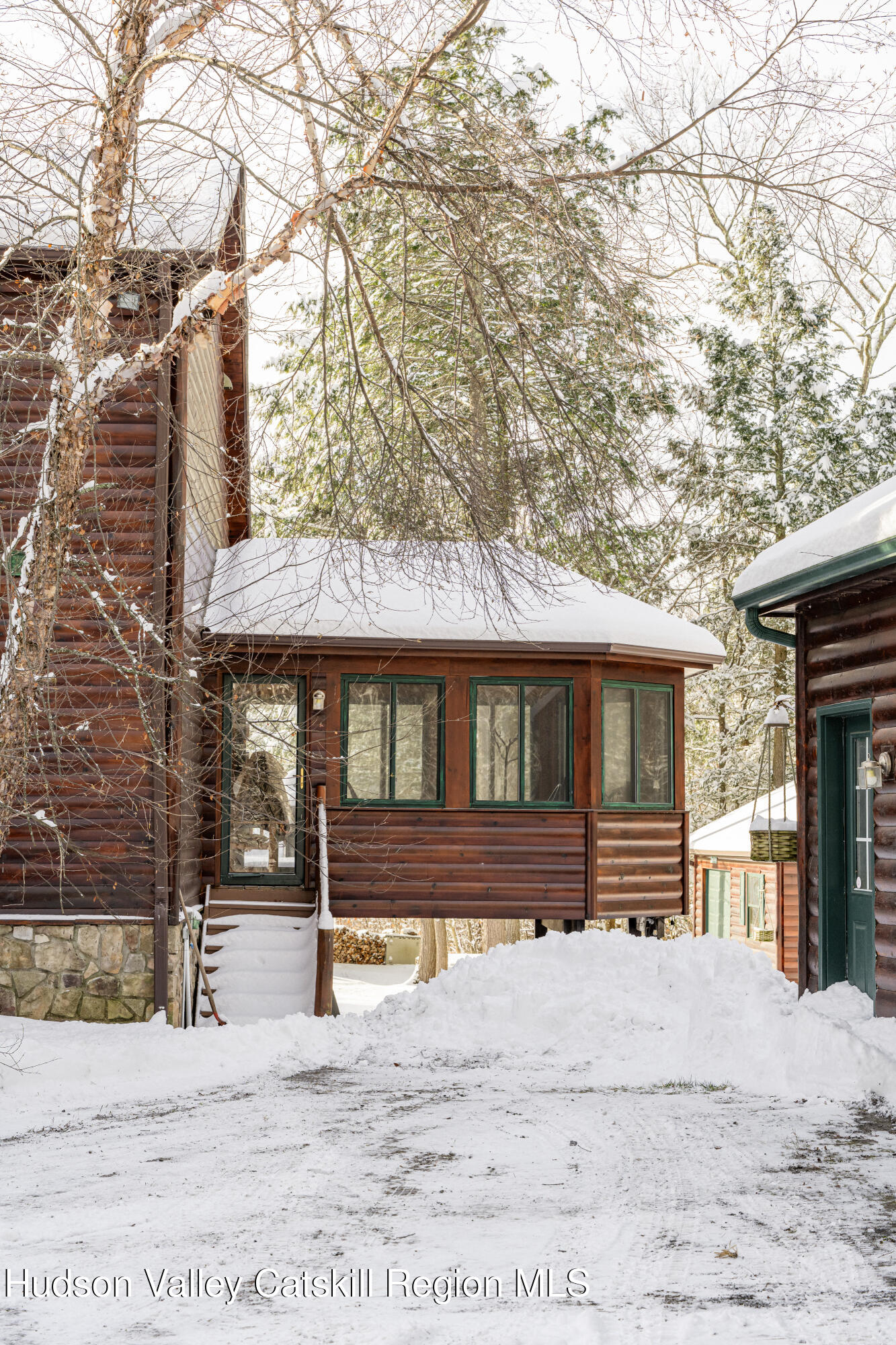 Set on a private mountainside in the Catskills village of Lexington, this expansive log home enjoys open, long-distance views directly into one of the Catskills' most dramatic mountain passes, defined by steep ridgelines and a broad notch that changes visibly with weather and season.