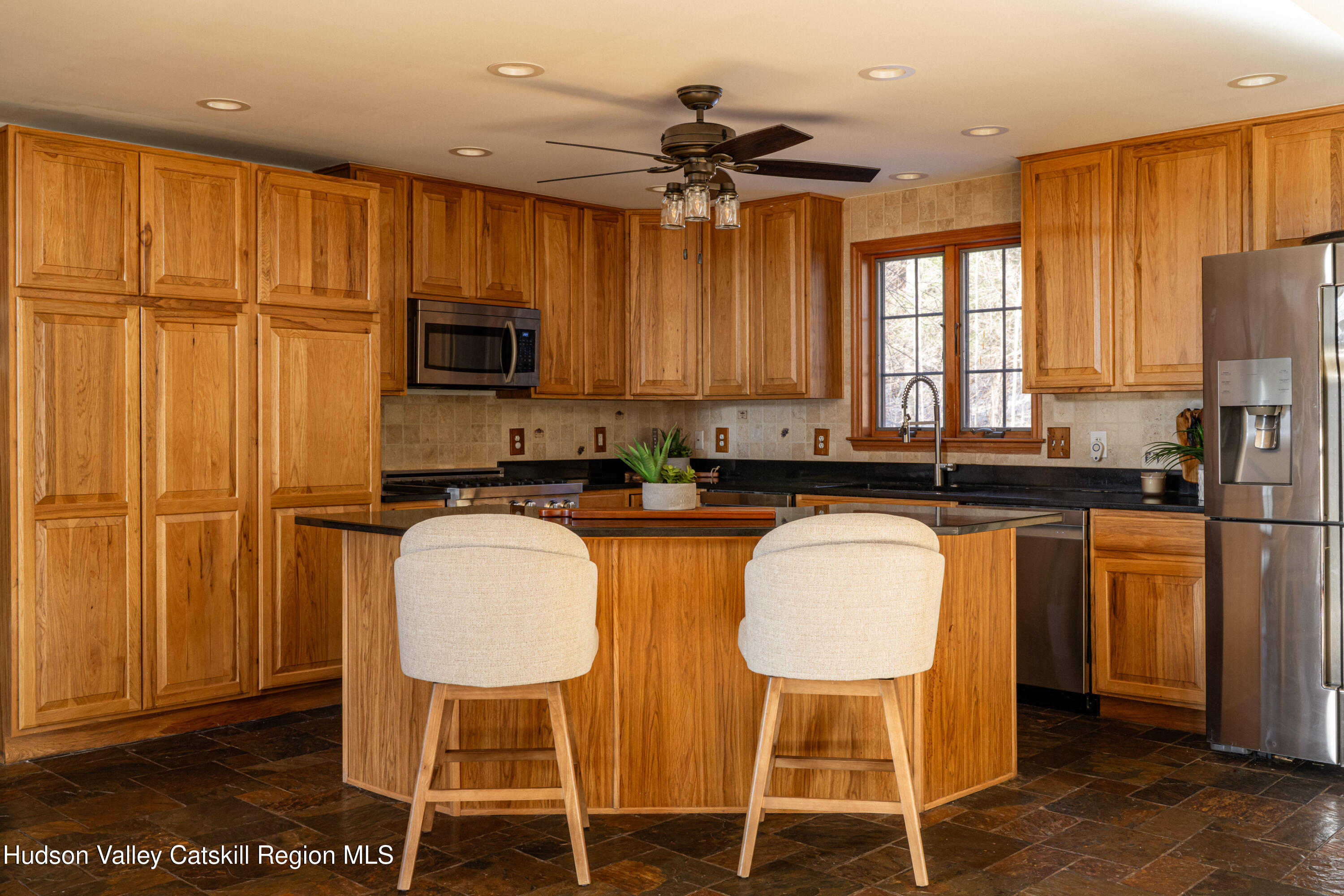 Arranged over three floors, the home is anchored by a vaulted great room with a stone, wood-burning fireplace, alongside a generously sized dining room and kitchen designed for gathering. In total, the home offers five additional flexible rooms suitable for offices, studios, recreation rooms, guest spaces, or other private-use areas.