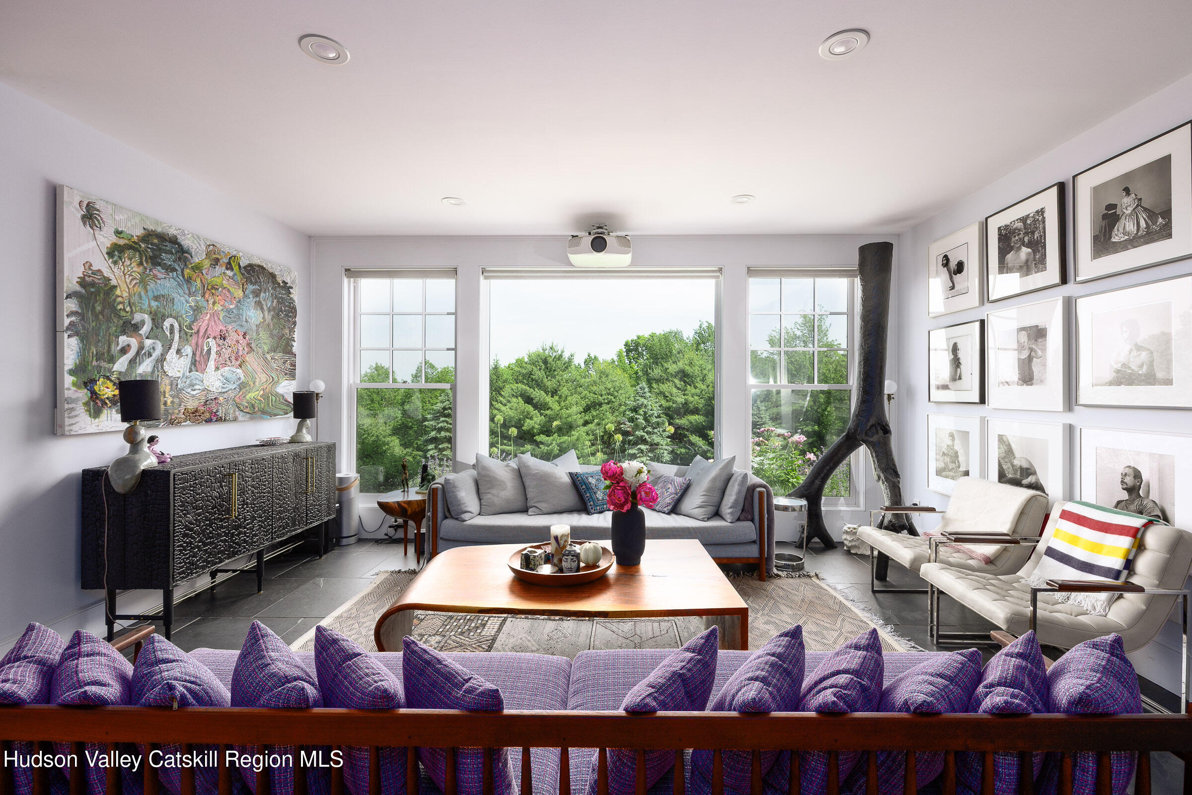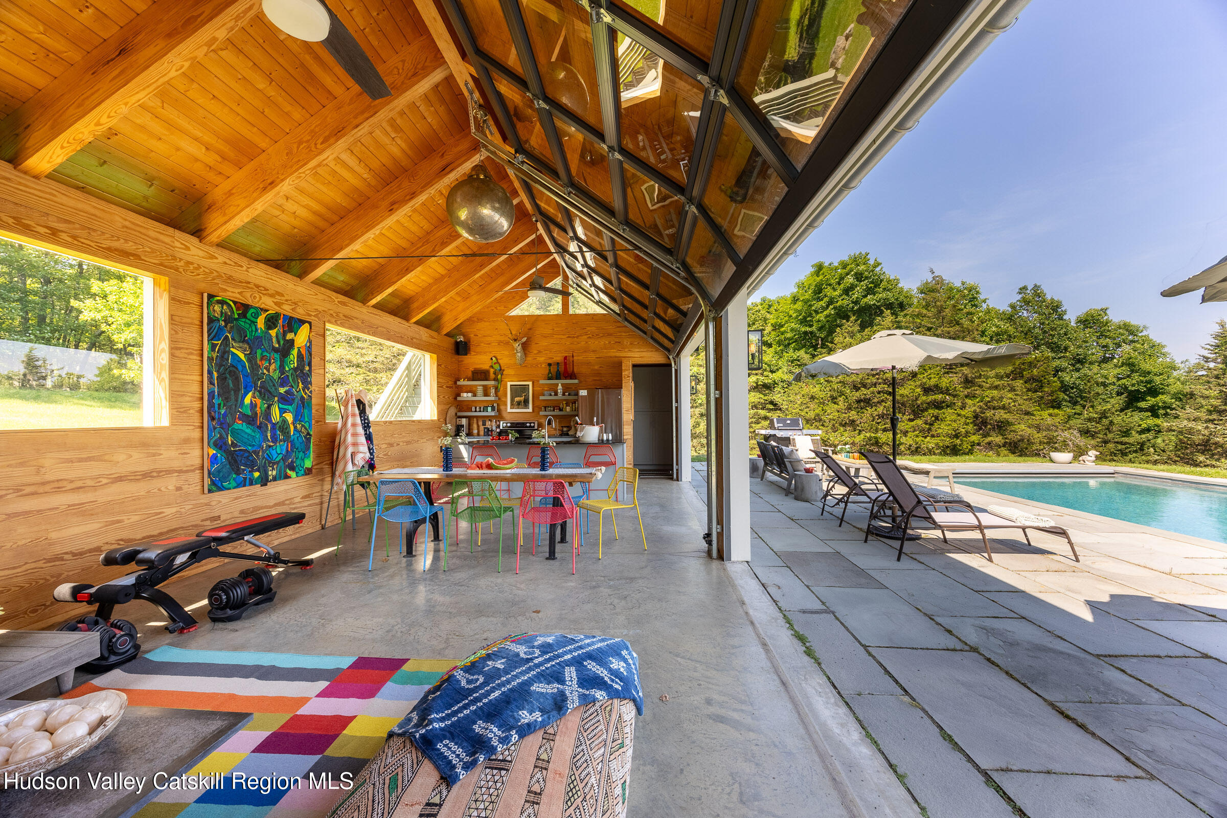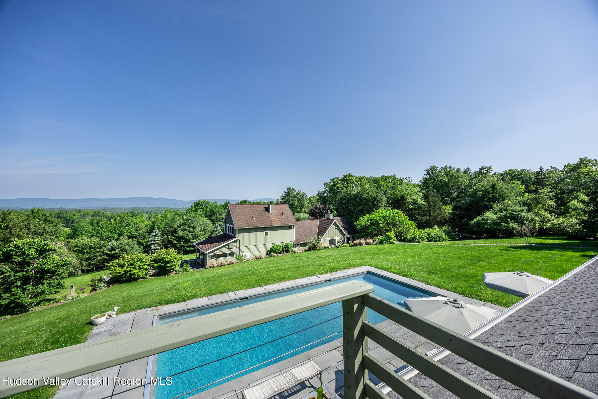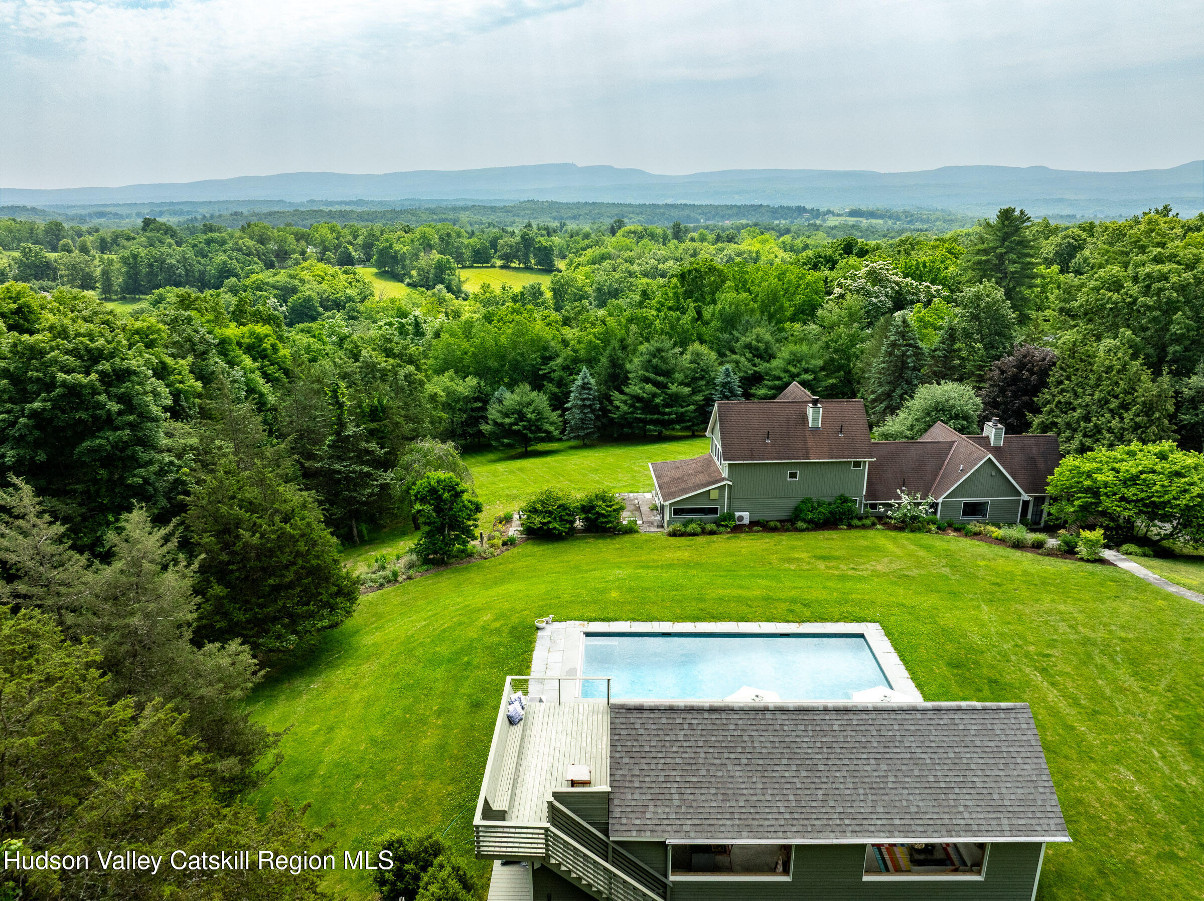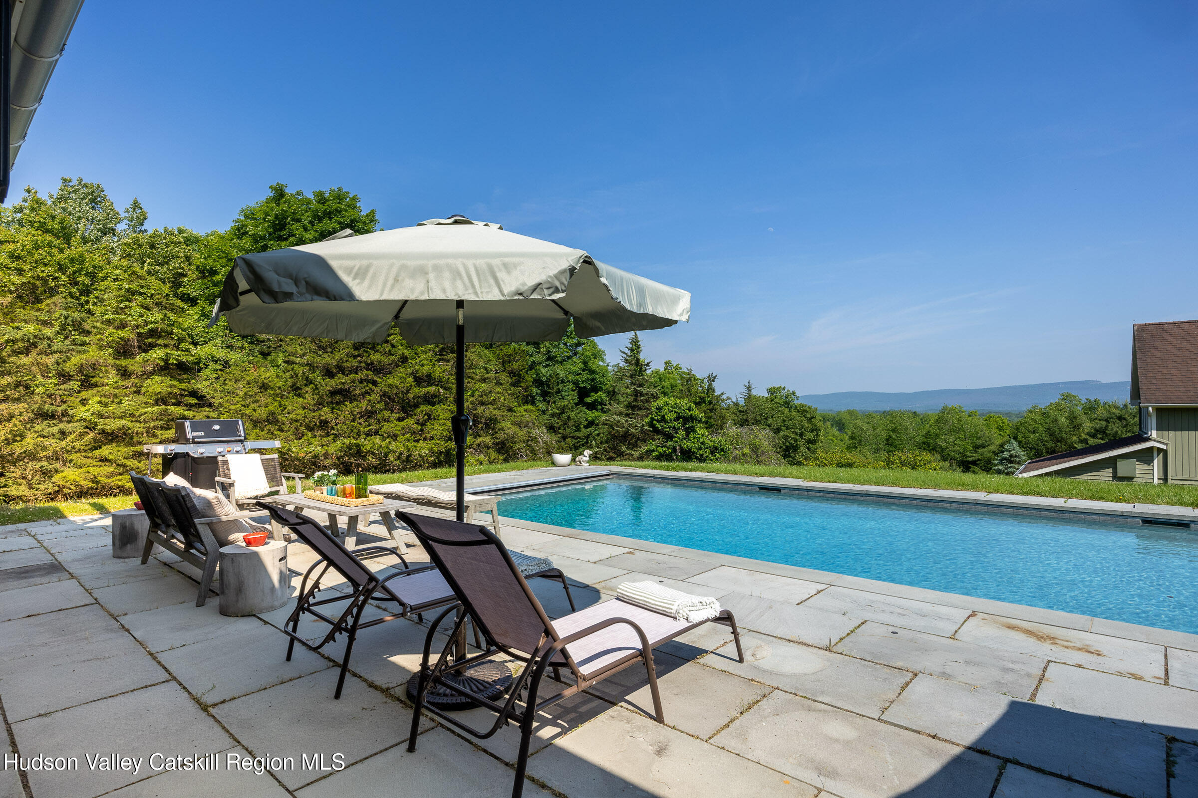 Set on 7.5 private acres with sweeping, cinematic views of the Shawangunk Ridge--including a direct sightline to the iconic Sky Top Tower--this completely reimagined property offers a rare blend of thoughtful design, refined comfort, and serene natural beauty. Since purchasing the home in 2015, the current owners have transformed it from the ground up. Working with a prominent architect, they redesigned the layout to enhance flow and functionality while creating a home that feels cohesive, intentional, and beautifully resolved. Expansive picture windows throughout the home frame the surrounding landscape and fill the interior with light. The living room features custom built-ins, a large wood-burning fireplace, and exposed beams--elements that lend warmth and character to the modern aesthetic. The kitchen is outfitted with custom cabinetry and high-end appliances, and just off the kitchen, a bluestone patio invites al fresco dining in warm months. The main-level primary suite includes a separate sitting room--perfect as a den, office, or a quiet retreat--and a bedroom with another cozy wood-burning fireplace and an abundance of windows that bring in light and views. Upstairs are two generously sized guest bedrooms and a full bath, both with beautiful views of the Ridge. Outdoors, a heated gunite saline pool sits alongside a stylish pool house complete with a full kitchen, powder room, and a rooftop deck offering jaw-dropping vistas. There's also a separate studio with soaring ceilings, a bathroom, and full heating/cooling--currently used as a large art space, and easily adaptable as a workshop or creative studio. Between the indoor layout, the bluestone patio, the pool, rooftop deck, and fully equipped pool house, this home is truly an entertainer's dream--perfect for hosting large gatherings or enjoying quiet personal retreats.