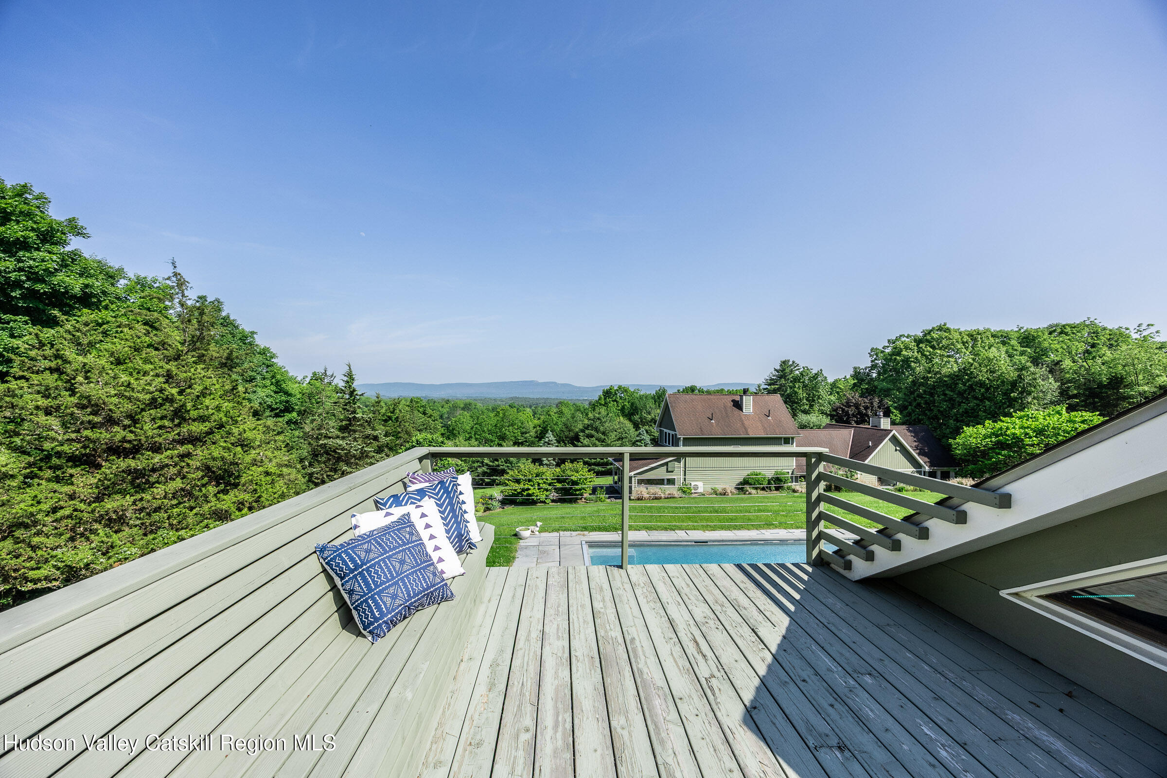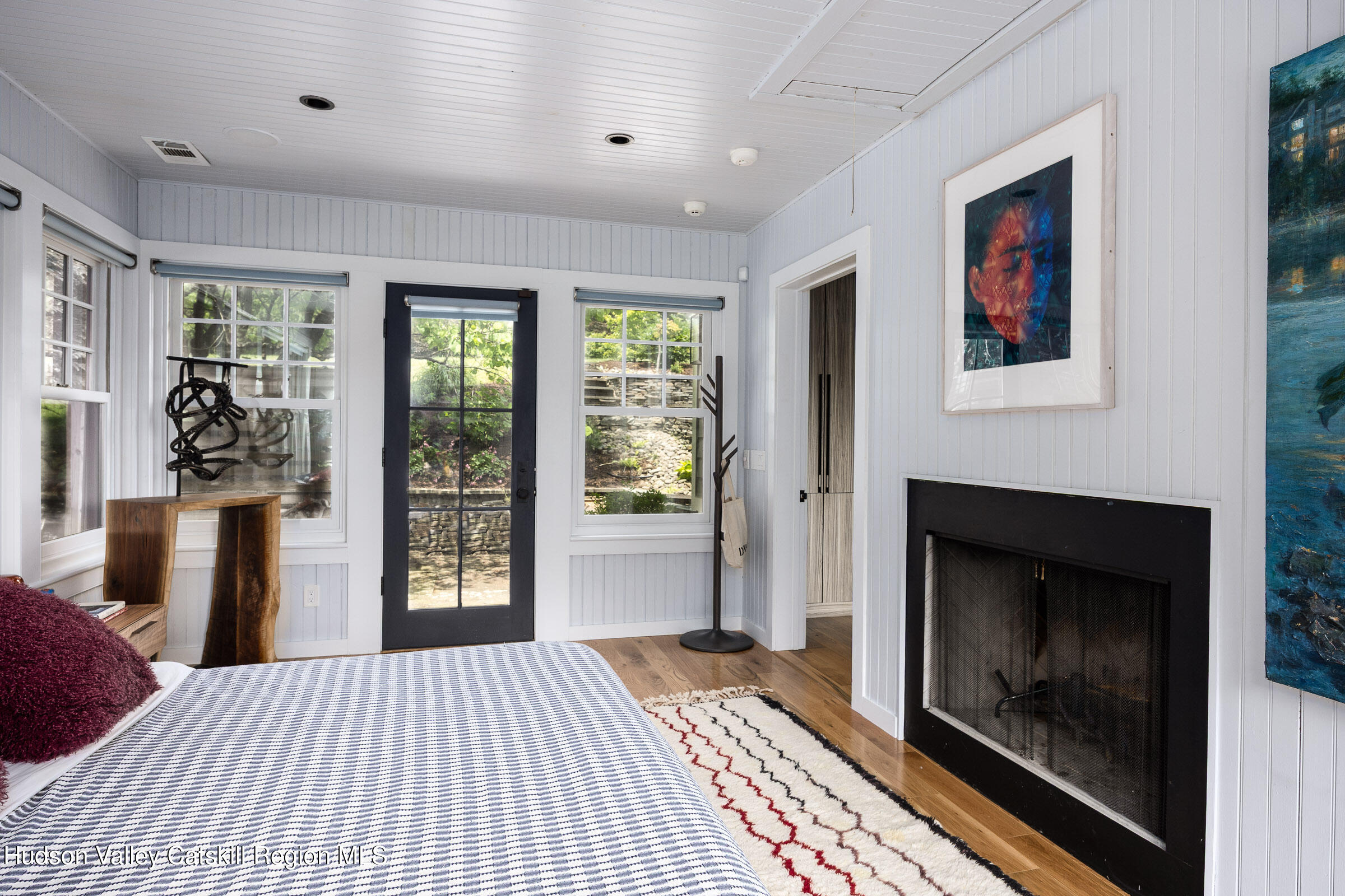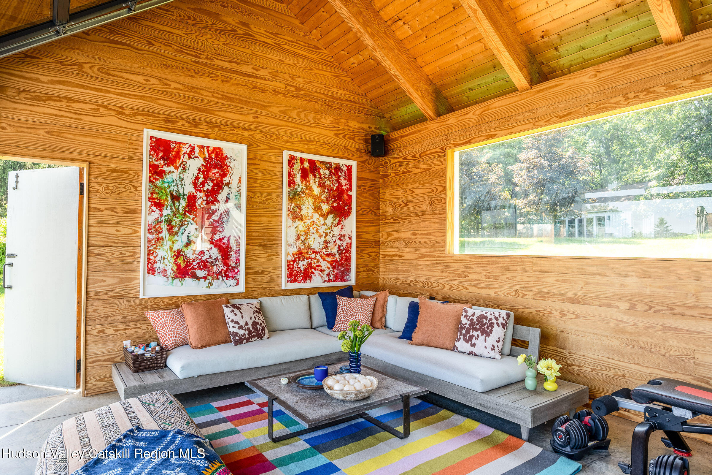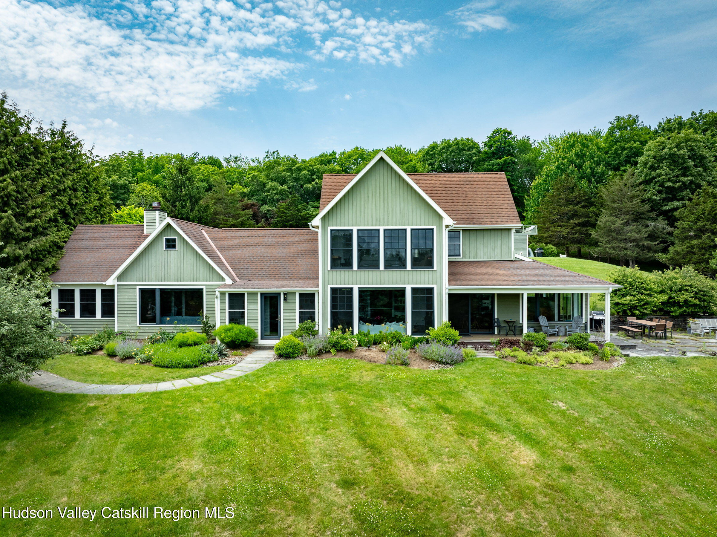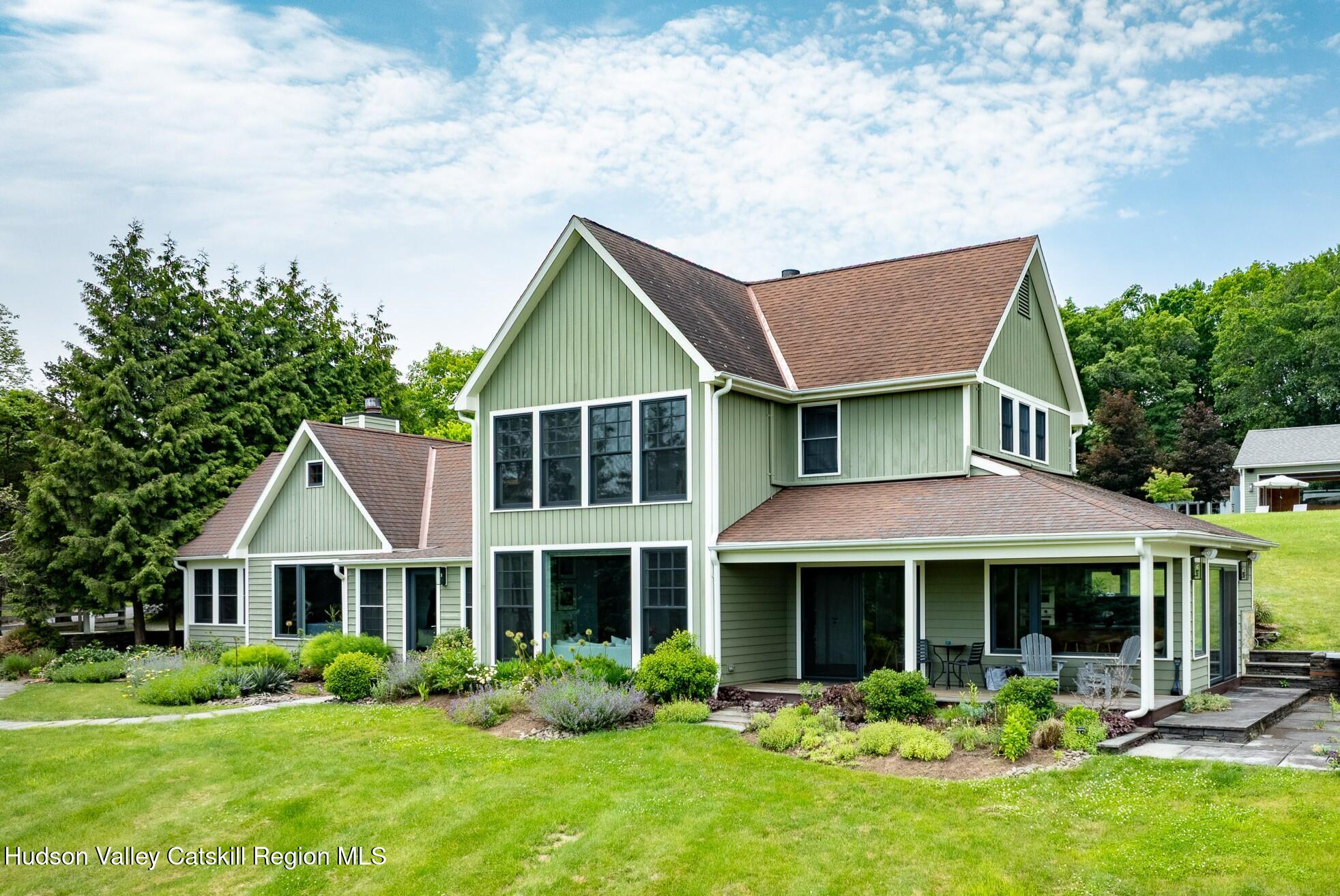 Set on 7.5 private acres with sweeping, cinematic views of the Shawangunk Ridge--including a direct sightline to the iconic Sky Top Tower--this completely reimagined property offers a rare blend of thoughtful design, refined comfort, and serene natural beauty. Since purchasing the home in 2015, the current owners have transformed it from the ground up. Working with a prominent architect, they redesigned the layout to enhance flow and functionality while creating a home that feels cohesive, intentional, and beautifully resolved. Expansive picture windows throughout the home frame the surrounding landscape and fill the interior with light. The living room features custom built-ins, a large wood-burning fireplace, and exposed beams--elements that lend warmth and character to the modern aesthetic. The kitchen is outfitted with custom cabinetry and high-end appliances, and just off the kitchen, a bluestone patio invites al fresco dining in warm months. The main-level primary suite includes a separate sitting room--perfect as a den, office, or a quiet retreat--and a bedroom with another cozy wood-burning fireplace and an abundance of windows that bring in light and views. Upstairs are two generously sized guest bedrooms and a full bath, both with beautiful views of the Ridge. Outdoors, a heated gunite saline pool sits alongside a stylish pool house complete with a full kitchen, powder room, and a rooftop deck offering jaw-dropping vistas. There's also a separate studio with soaring ceilings, a bathroom, and full heating/cooling--currently used as a large art space, and easily adaptable as a workshop or creative studio. Between the indoor layout, the bluestone patio, the pool, rooftop deck, and fully equipped pool house, this home is truly an entertainer's dream--perfect for hosting large gatherings or enjoying quiet personal retreats.