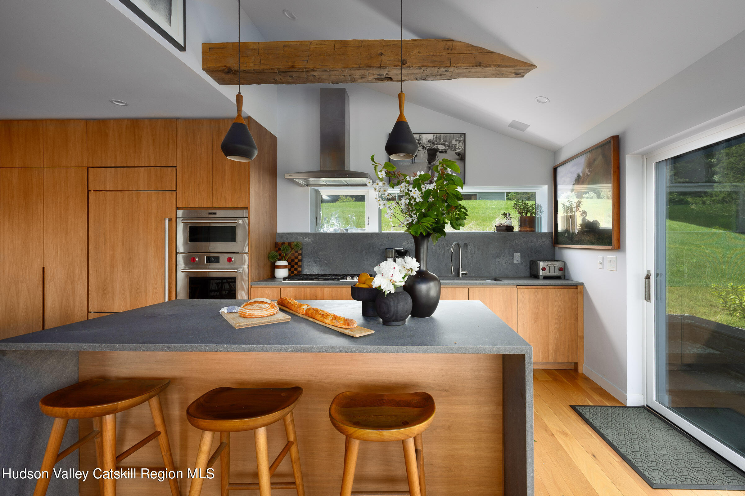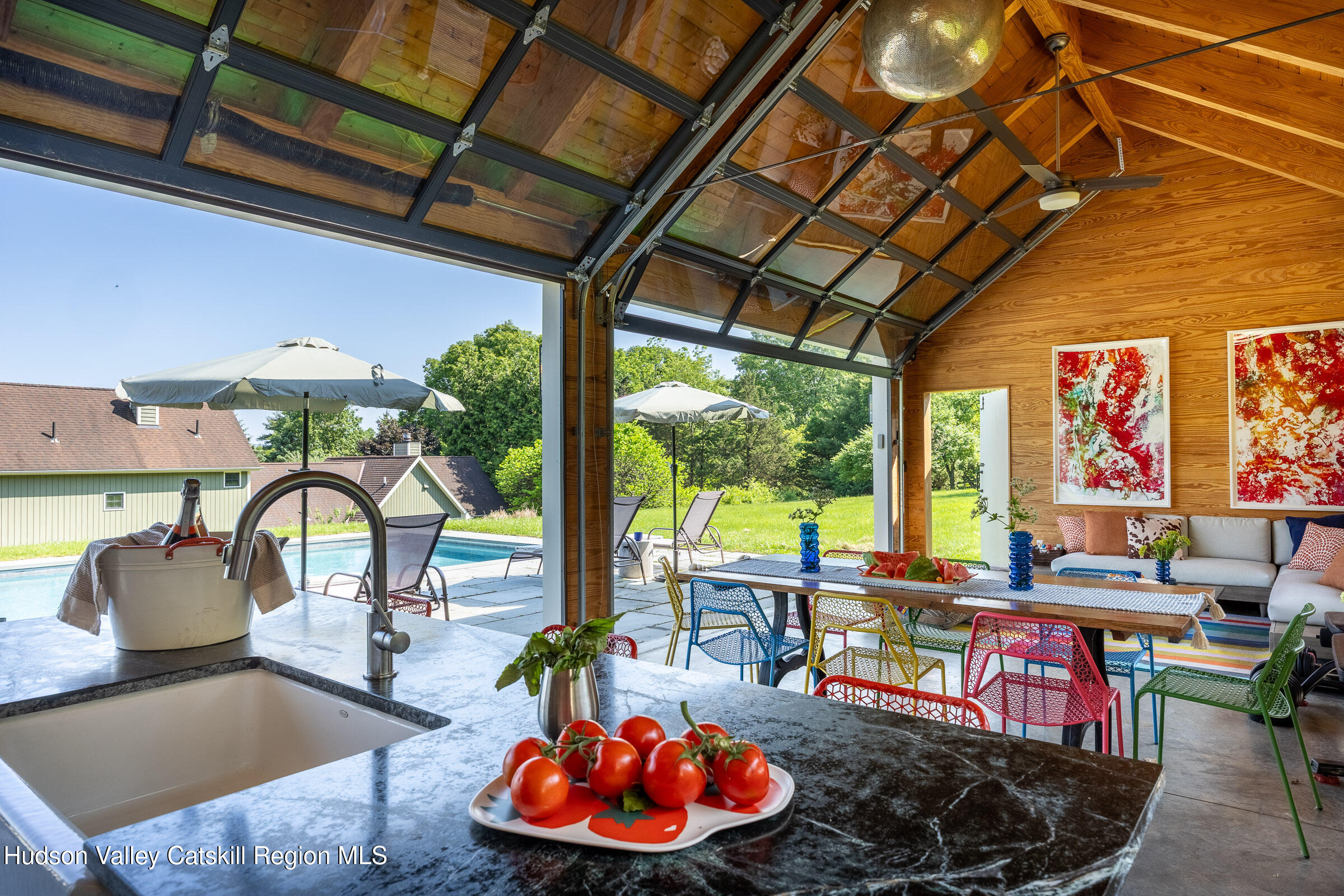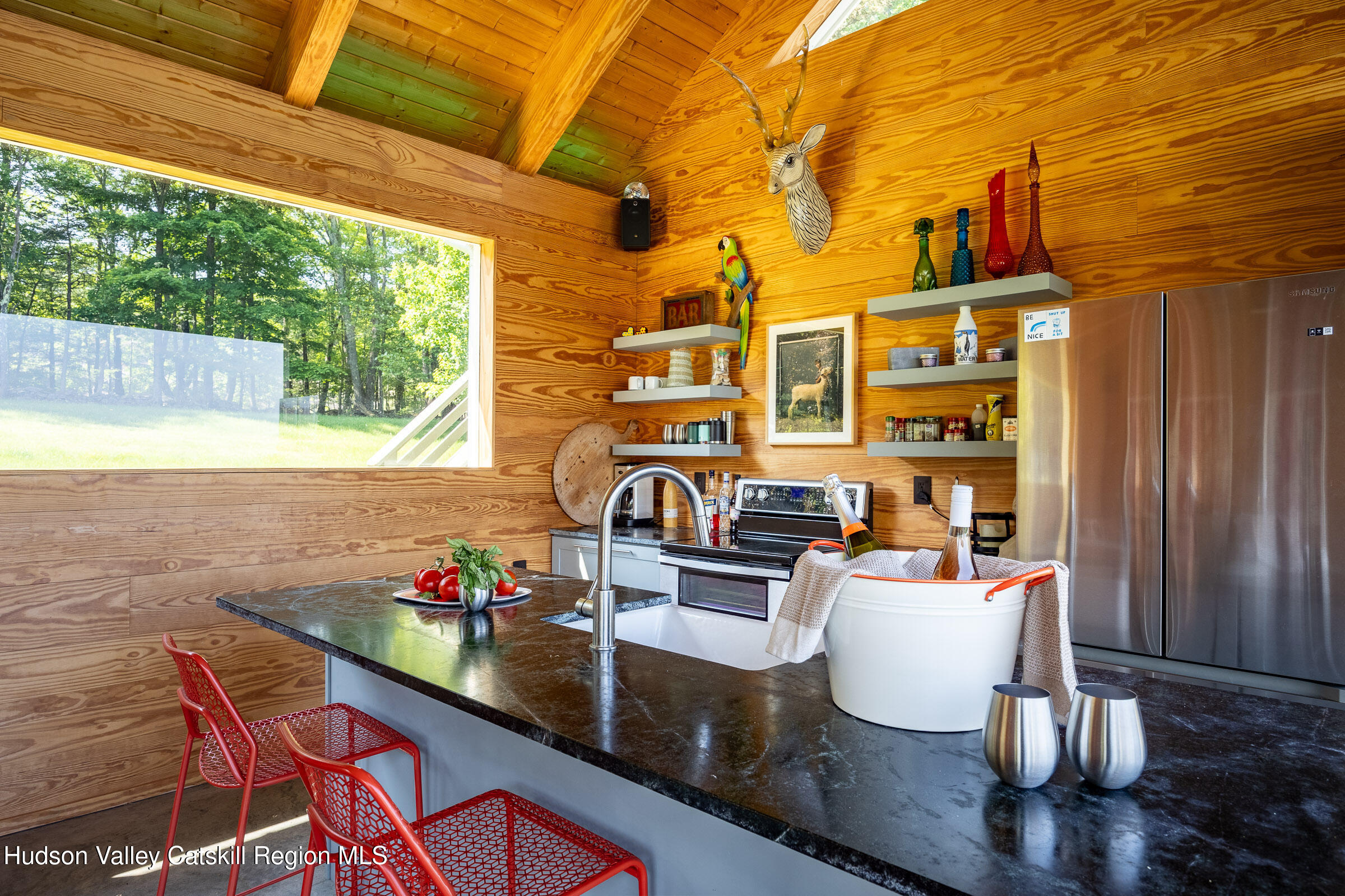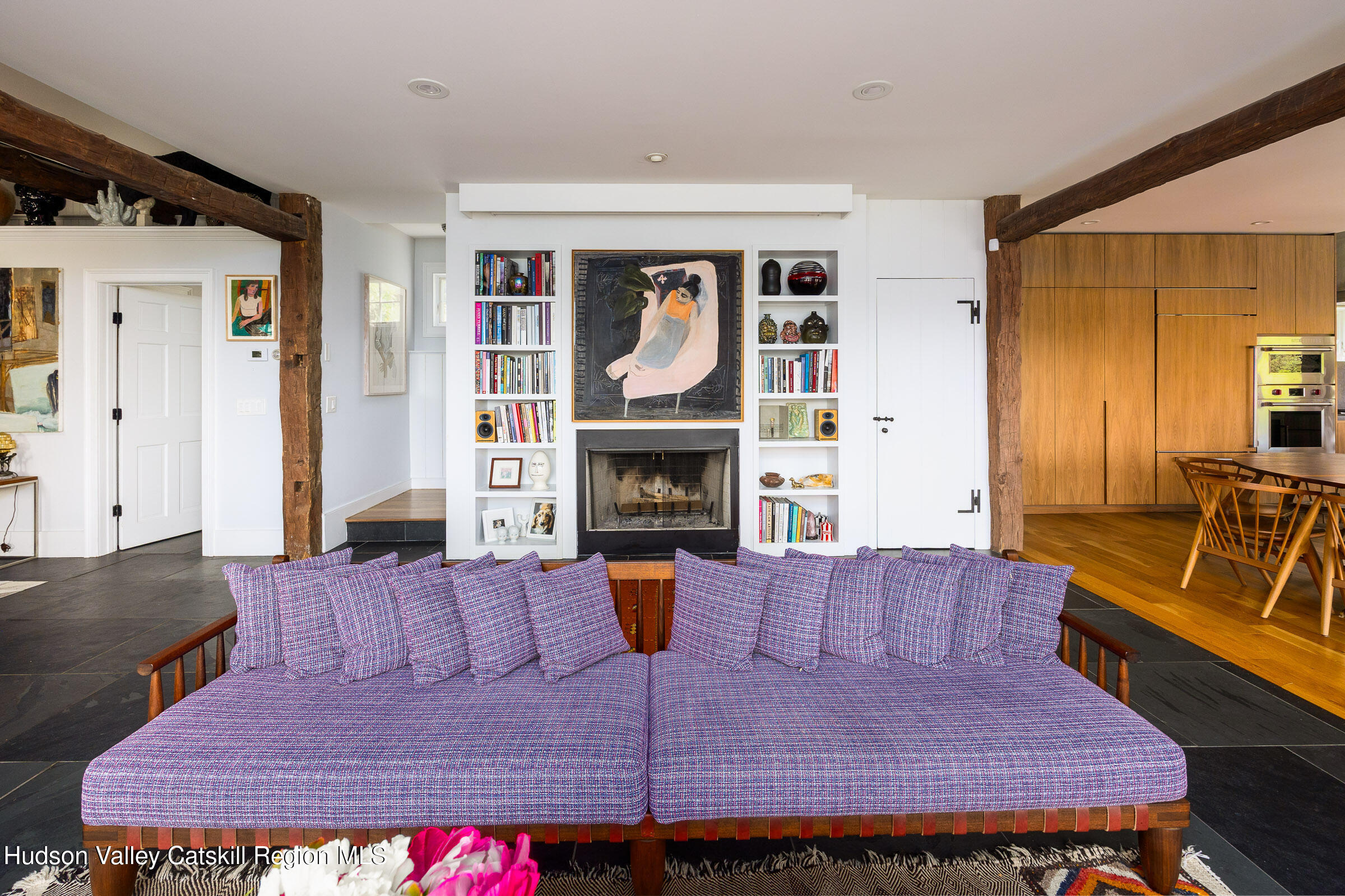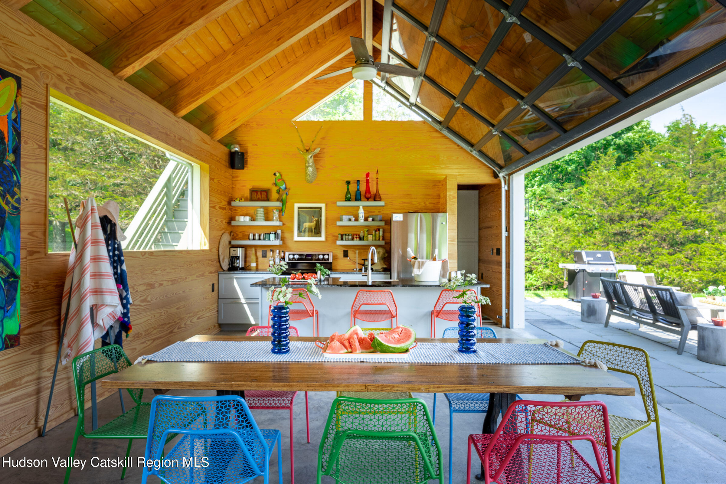 Set on 7.5 private acres with sweeping, cinematic views of the Shawangunk Ridge--including a direct sightline to the iconic Sky Top Tower--this completely reimagined property offers a rare blend of thoughtful design, refined comfort, and serene natural beauty. Since purchasing the home in 2015, the current owners have transformed it from the ground up. Working with a prominent architect, they redesigned the layout to enhance flow and functionality while creating a home that feels cohesive, intentional, and beautifully resolved. Expansive picture windows throughout the home frame the surrounding landscape and fill the interior with light. The living room features custom built-ins, a large wood-burning fireplace, and exposed beams--elements that lend warmth and character to the modern aesthetic. The kitchen is outfitted with custom cabinetry and high-end appliances, and just off the kitchen, a bluestone patio invites al fresco dining in warm months. The main-level primary suite includes a separate sitting room--perfect as a den, office, or a quiet retreat--and a bedroom with another cozy wood-burning fireplace and an abundance of windows that bring in light and views. Upstairs are two generously sized guest bedrooms and a full bath, both with beautiful views of the Ridge. Outdoors, a heated gunite saline pool sits alongside a stylish pool house complete with a full kitchen, powder room, and a rooftop deck offering jaw-dropping vistas. There's also a separate studio with soaring ceilings, a bathroom, and full heating/cooling--currently used as a large art space, and easily adaptable as a workshop or creative studio. Between the indoor layout, the bluestone patio, the pool, rooftop deck, and fully equipped pool house, this home is truly an entertainer's dream--perfect for hosting large gatherings or enjoying quiet personal retreats.