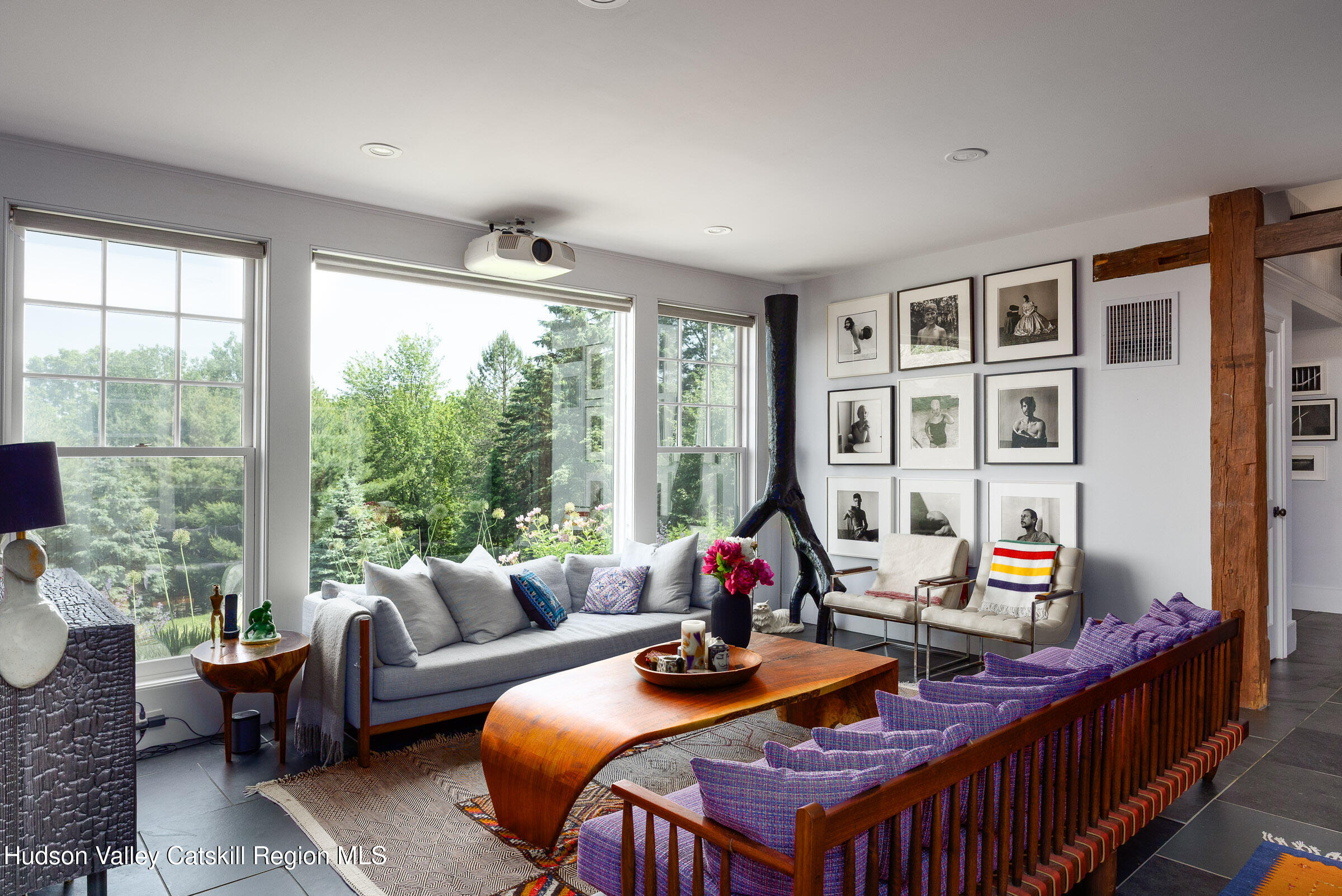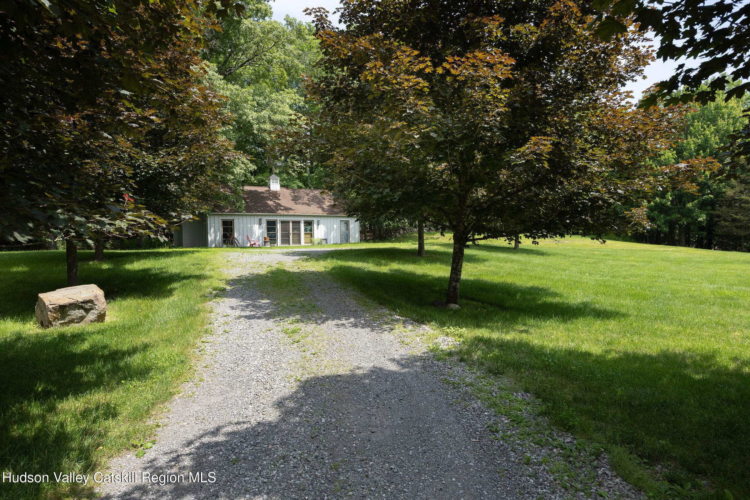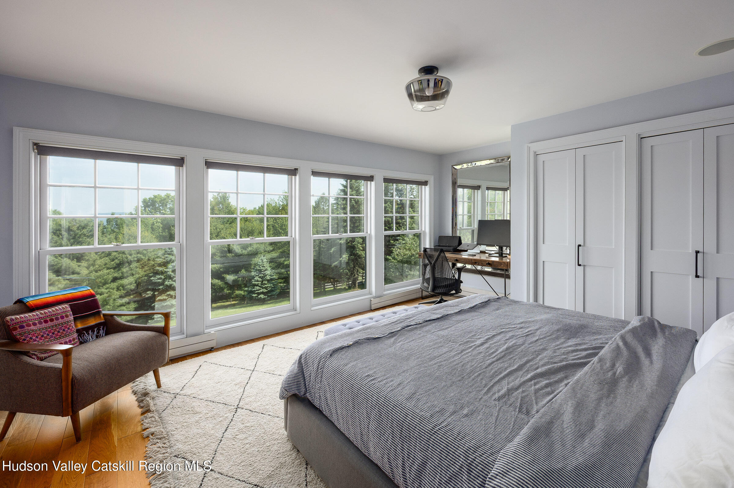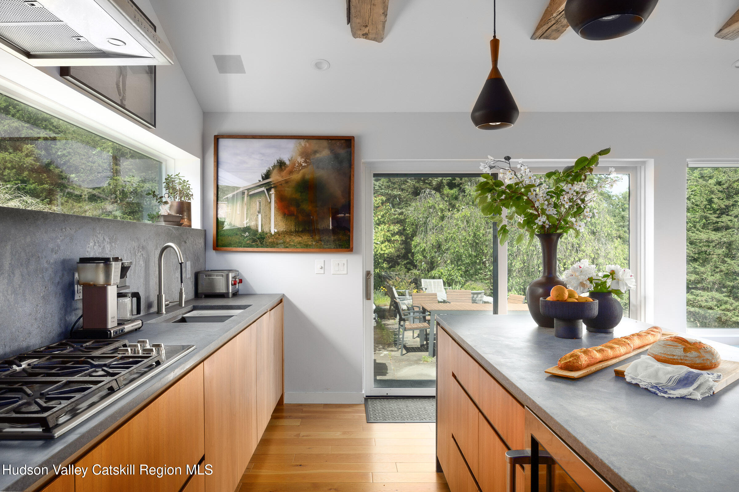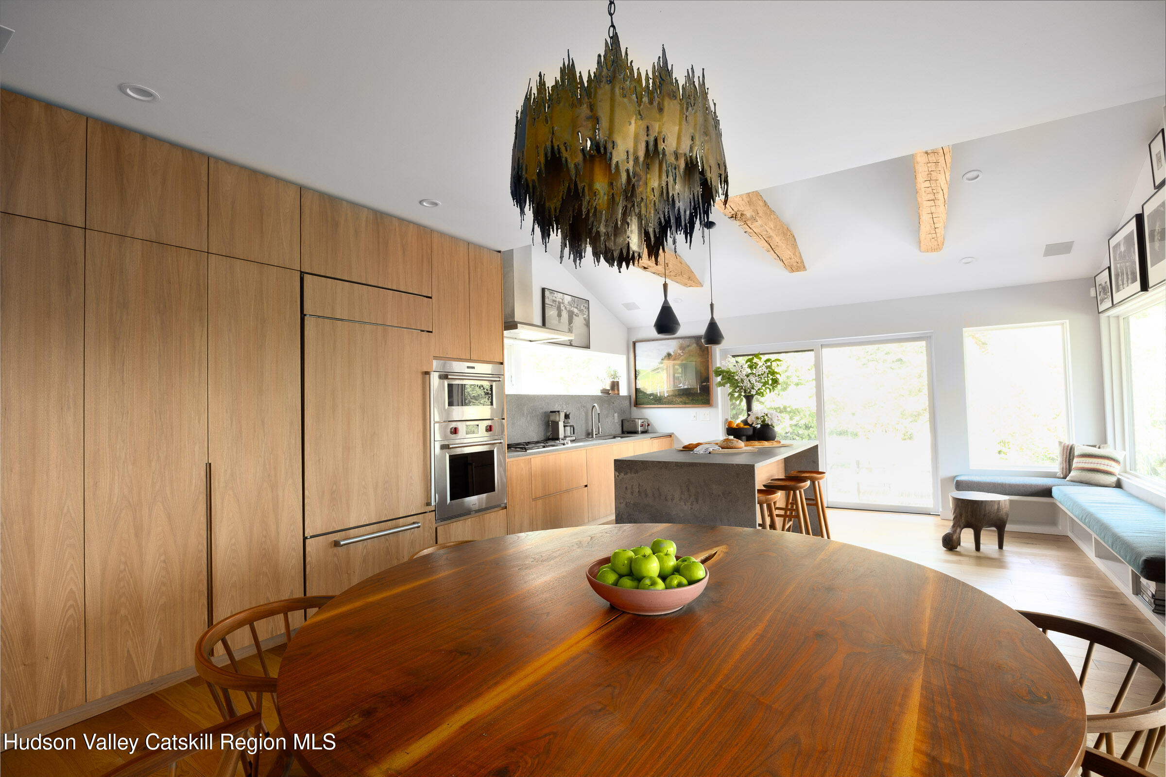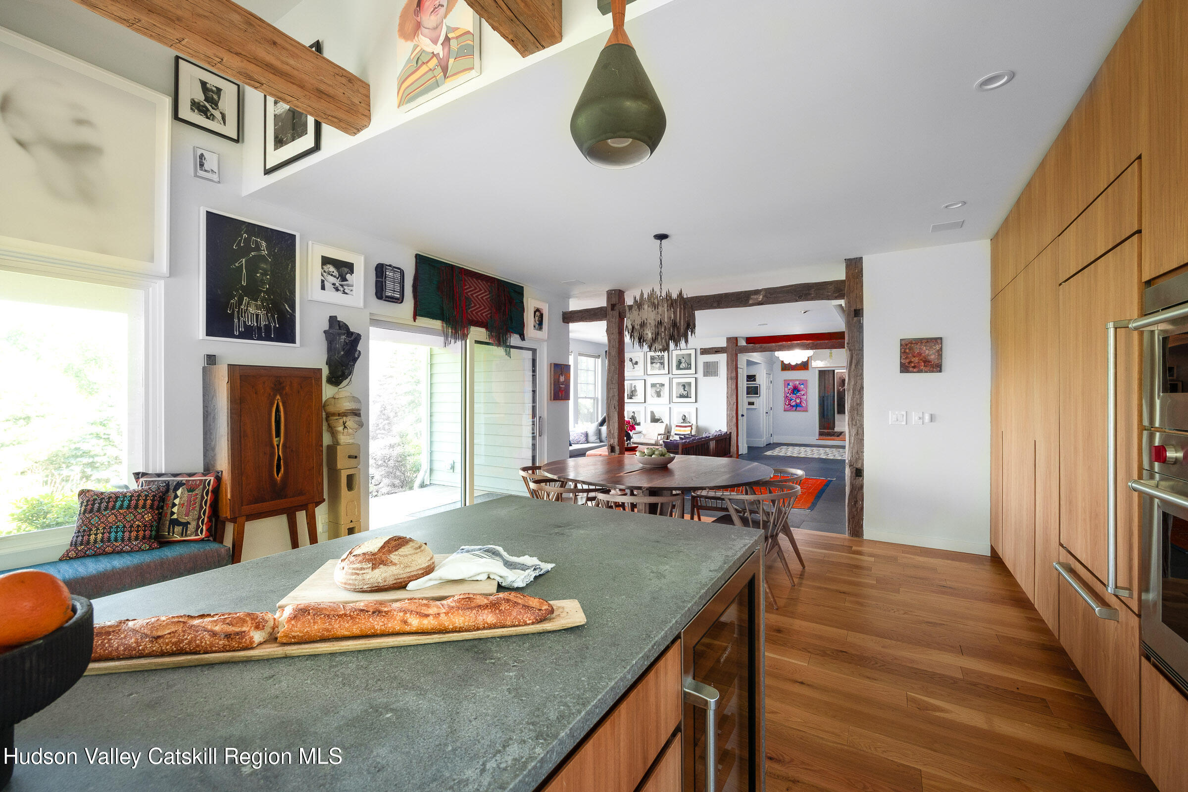 Set on 7.5 private acres with sweeping, cinematic views of the Shawangunk Ridge--including a direct sightline to the iconic Sky Top Tower--this completely reimagined property offers a rare blend of thoughtful design, refined comfort, and serene natural beauty. Since purchasing the home in 2015, the current owners have transformed it from the ground up. Working with a prominent architect, they redesigned the layout to enhance flow and functionality while creating a home that feels cohesive, intentional, and beautifully resolved. Expansive picture windows throughout the home frame the surrounding landscape and fill the interior with light. The living room features custom built-ins, a large wood-burning fireplace, and exposed beams--elements that lend warmth and character to the modern aesthetic. The kitchen is outfitted with custom cabinetry and high-end appliances, and just off the kitchen, a bluestone patio invites al fresco dining in warm months. The main-level primary suite includes a separate sitting room--perfect as a den, office, or a quiet retreat--and a bedroom with another cozy wood-burning fireplace and an abundance of windows that bring in light and views. Upstairs are two generously sized guest bedrooms and a full bath, both with beautiful views of the Ridge. Outdoors, a heated gunite saline pool sits alongside a stylish pool house complete with a full kitchen, powder room, and a rooftop deck offering jaw-dropping vistas. There's also a separate studio with soaring ceilings, a bathroom, and full heating/cooling--currently used as a large art space, and easily adaptable as a workshop or creative studio. Between the indoor layout, the bluestone patio, the pool, rooftop deck, and fully equipped pool house, this home is truly an entertainer's dream--perfect for hosting large gatherings or enjoying quiet personal retreats.