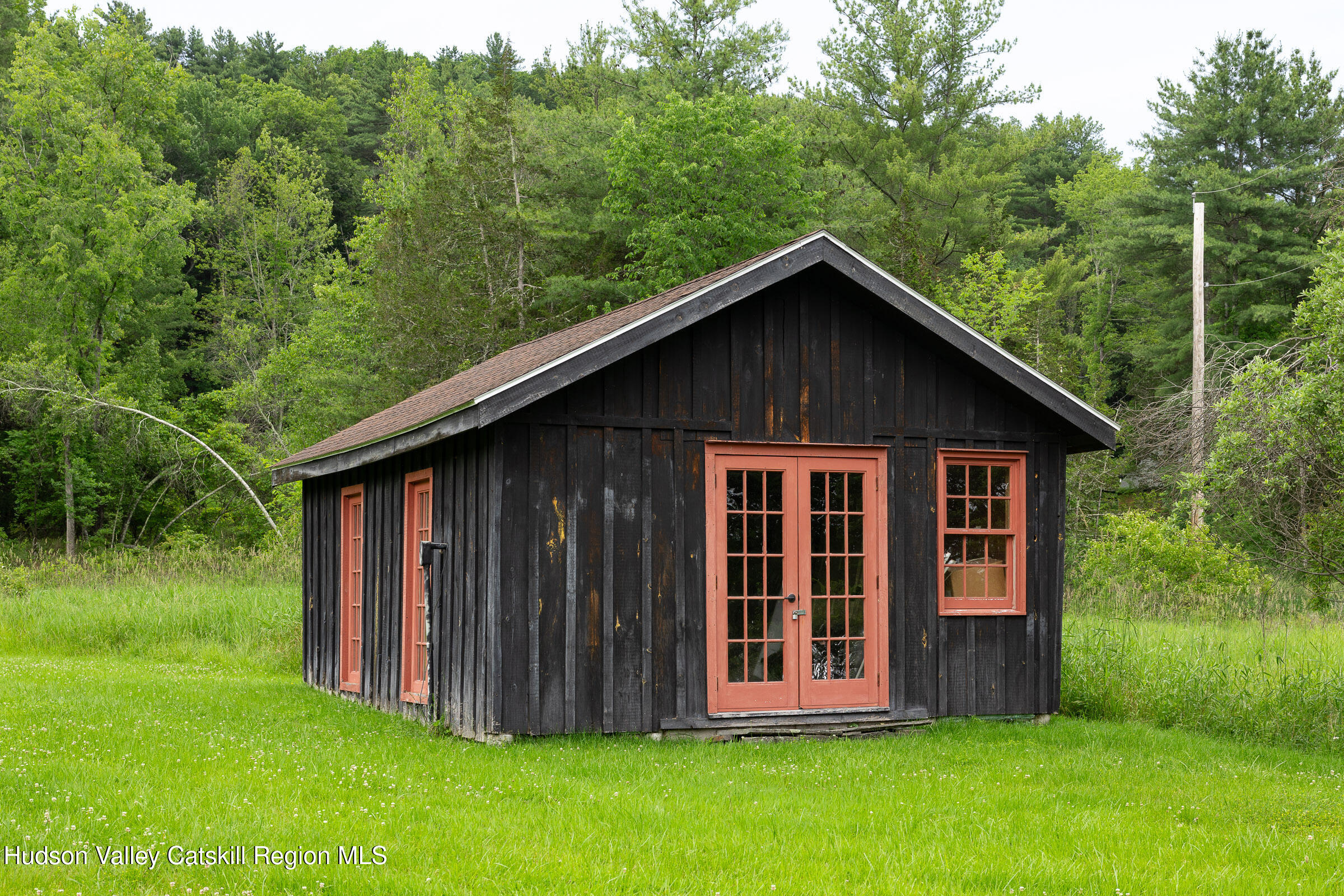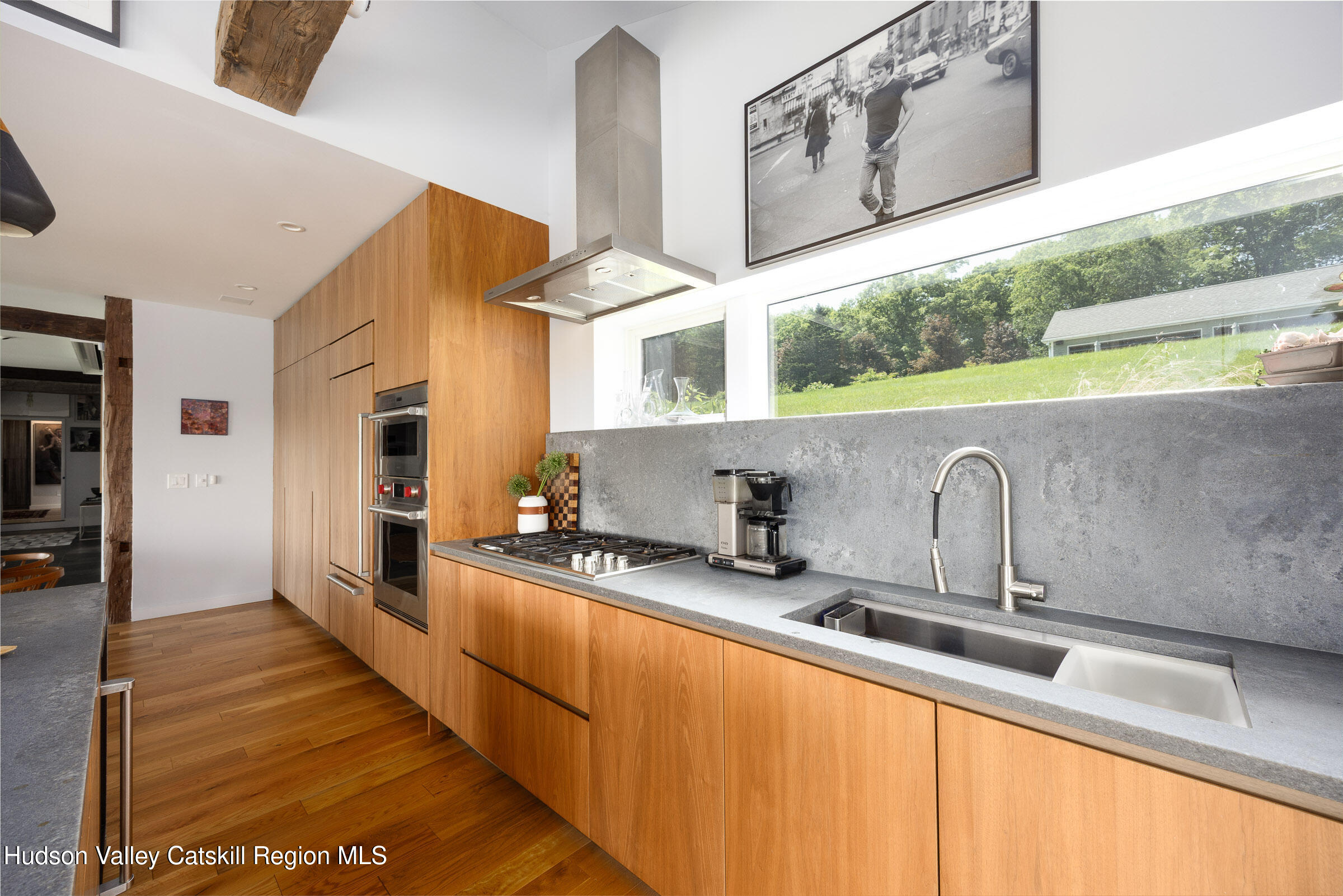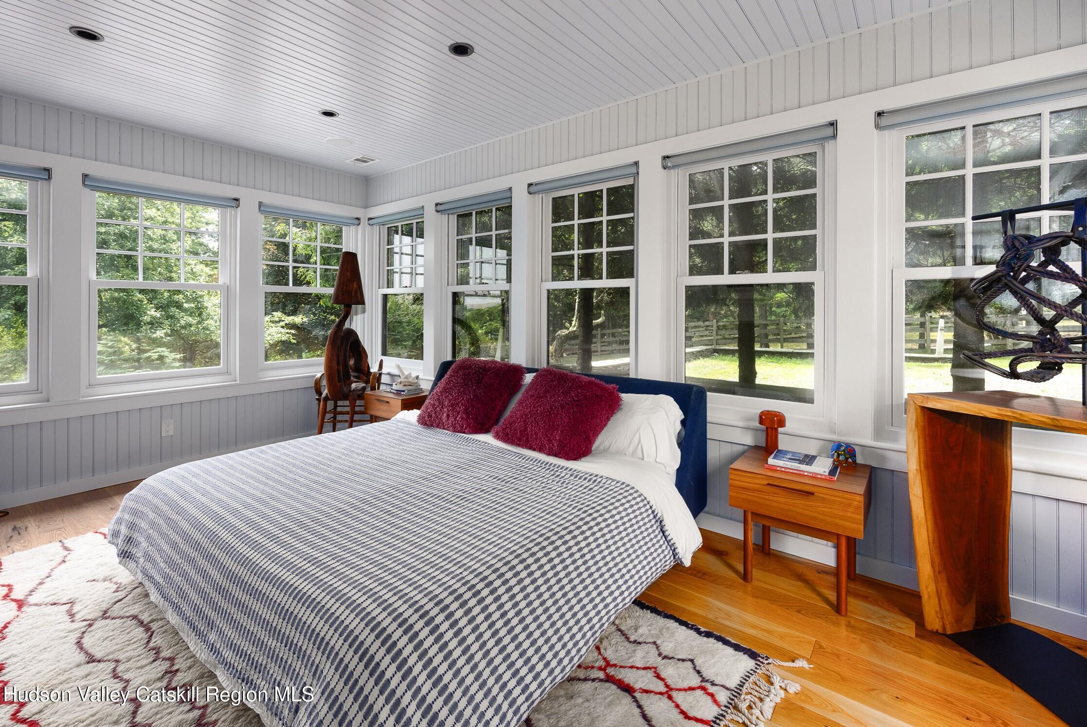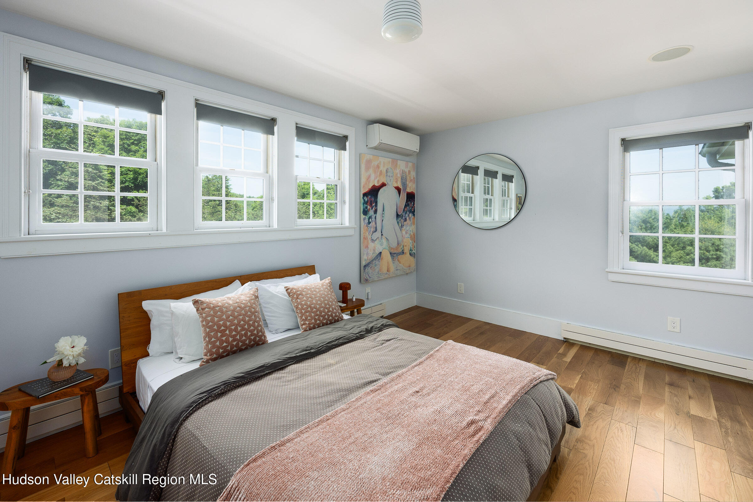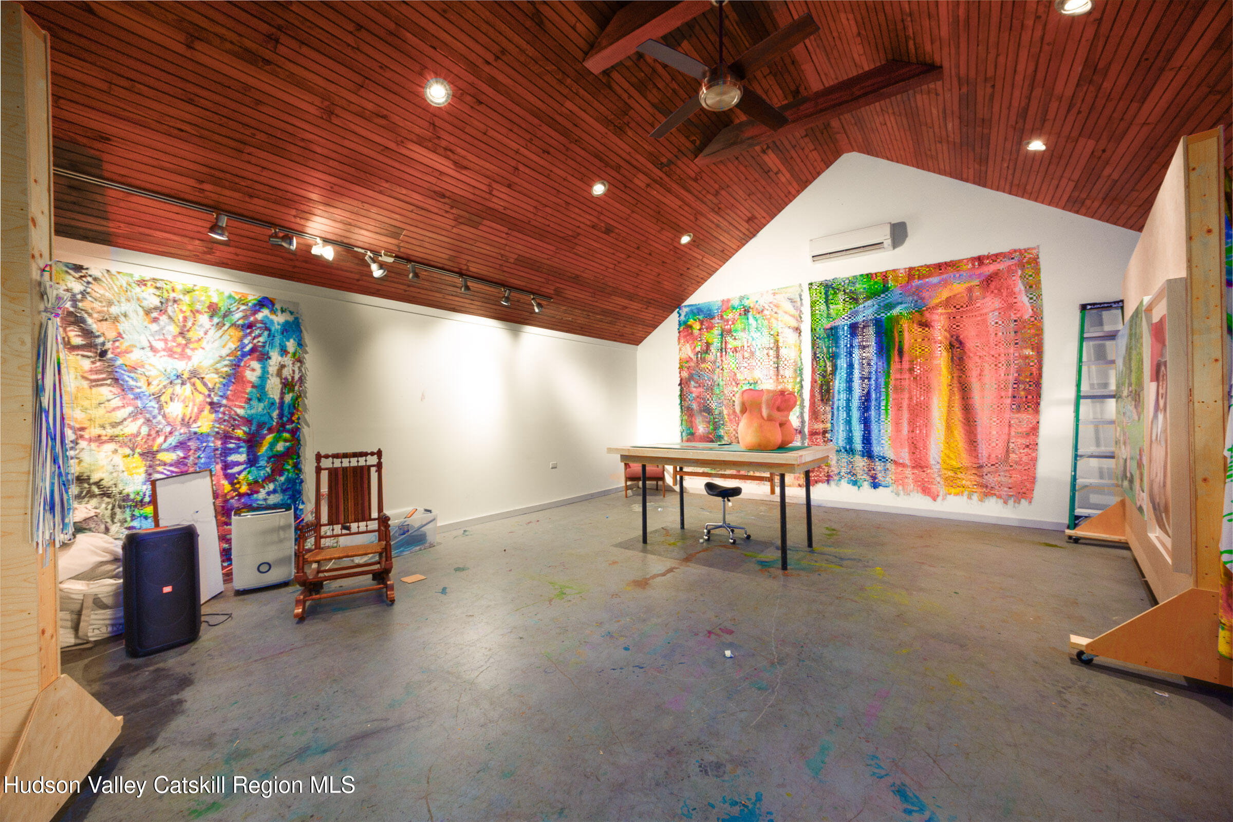 Set on 7.5 private acres with sweeping, cinematic views of the Shawangunk Ridge--including a direct sightline to the iconic Sky Top Tower--this completely reimagined property offers a rare blend of thoughtful design, refined comfort, and serene natural beauty. Since purchasing the home in 2015, the current owners have transformed it from the ground up. Working with a prominent architect, they redesigned the layout to enhance flow and functionality while creating a home that feels cohesive, intentional, and beautifully resolved. Expansive picture windows throughout the home frame the surrounding landscape and fill the interior with light. The living room features custom built-ins, a large wood-burning fireplace, and exposed beams--elements that lend warmth and character to the modern aesthetic. The kitchen is outfitted with custom cabinetry and high-end appliances, and just off the kitchen, a bluestone patio invites al fresco dining in warm months. The main-level primary suite includes a separate sitting room--perfect as a den, office, or a quiet retreat--and a bedroom with another cozy wood-burning fireplace and an abundance of windows that bring in light and views. Upstairs are two generously sized guest bedrooms and a full bath, both with beautiful views of the Ridge. Outdoors, a heated gunite saline pool sits alongside a stylish pool house complete with a full kitchen, powder room, and a rooftop deck offering jaw-dropping vistas. There's also a separate studio with soaring ceilings, a bathroom, and full heating/cooling--currently used as a large art space, and easily adaptable as a workshop or creative studio. Between the indoor layout, the bluestone patio, the pool, rooftop deck, and fully equipped pool house, this home is truly an entertainer's dream--perfect for hosting large gatherings or enjoying quiet personal retreats.