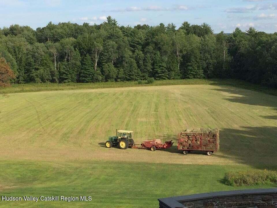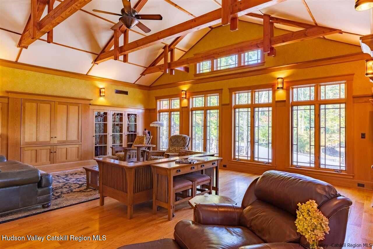 This sophisticated Arts and Crafts home sits on 14 rolling acres on one of Accord's most charming roads. Extensive use of quarter-sawn oak in flooring, paneling and moldings pays homage to the movement most often associated with the Stickleys, along with period-appropriate detail and workmanship, both inside and out. Brick paved walkways, stone walls and a covered piazza, as well as an inground saline pool with full outdoor kitchen add to the allure. The house is spacious and appointed with the finest of materials, including Waterworks outfitted bathrooms. There's an inglenook with a brick wood-burning fireplace off the large living room, which has extensive built ins with leaded vintage glass and a beamed, vaulted ceiling. A Tulikivi soapstone woodstove separates the living room and dining room, and besides providing delicious warmth, it features ovens which allow wood fire cooking. The magnificent kitchen with superb appliances, custom cabinets and a useful pantry is a cook's delight. Three bright and comfortable bedrooms and 1 1/2 bathrooms complete the first floor. Upstairs is reserved as the primary bedroom suite with two full bathrooms, large sitting area, walk- in closet, woodstove, and a balcony overlooking the magical property. With its own driveway, but also accessed past the pond and over a footbridge over the stream, the 1200 square foot studio has its own full bathroom and would make an ideal home office, gym, or overflow guest space. The property enjoys an agricultural tax exemption whereby a local farmer hays the fields. Subdivision of the land might be possible as there's alternate access on an adjacent road. The house was built in 2001 as an expansion of a small pre-existing house that was built in 1976.